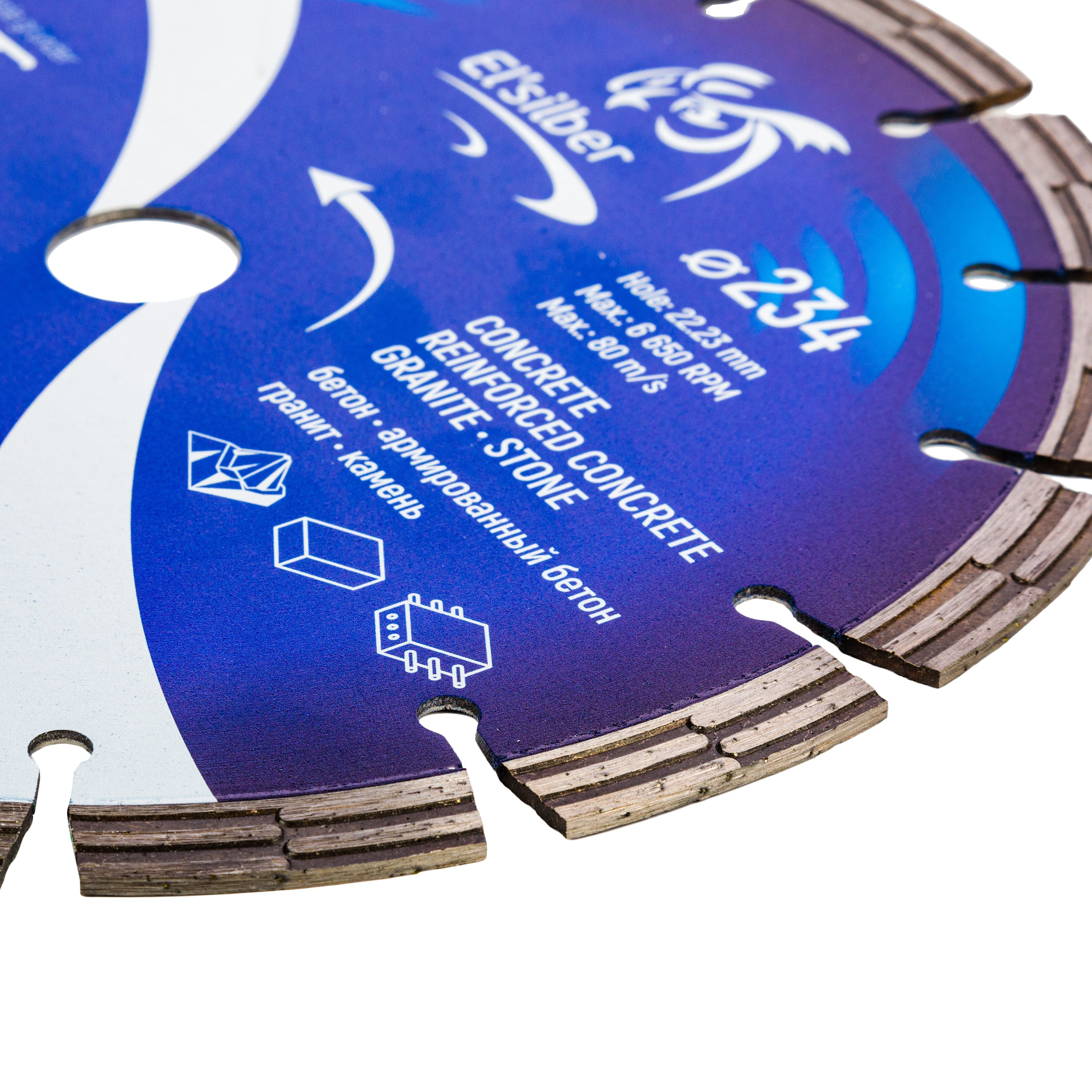 Круг алмазный 1A1RSS/HTW "VerstarKT" Elsilber - специальная разработка для решения строительных задач широкого спектра. Выпускаются диаметрами 129, 150, 234 и 354 мм. Продвинутая форма сегментов обеспечивает дополнительное эффективное охлаждение при полном погружении режущей части в материал. Диск универсален для работы с твердыми материалами, используется в работе с бетоном, армированным и высокоармированным бетоном. Применим для работ по штроблению под электропроводку и водопровод.