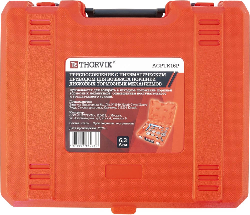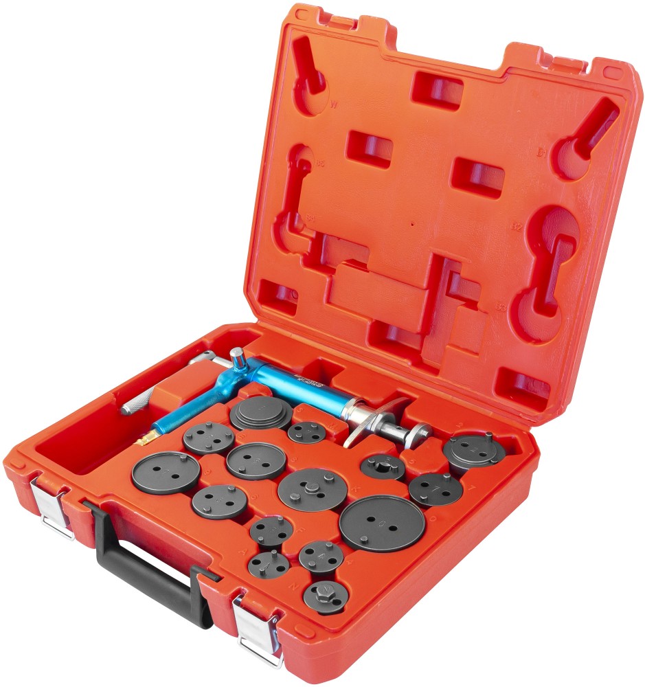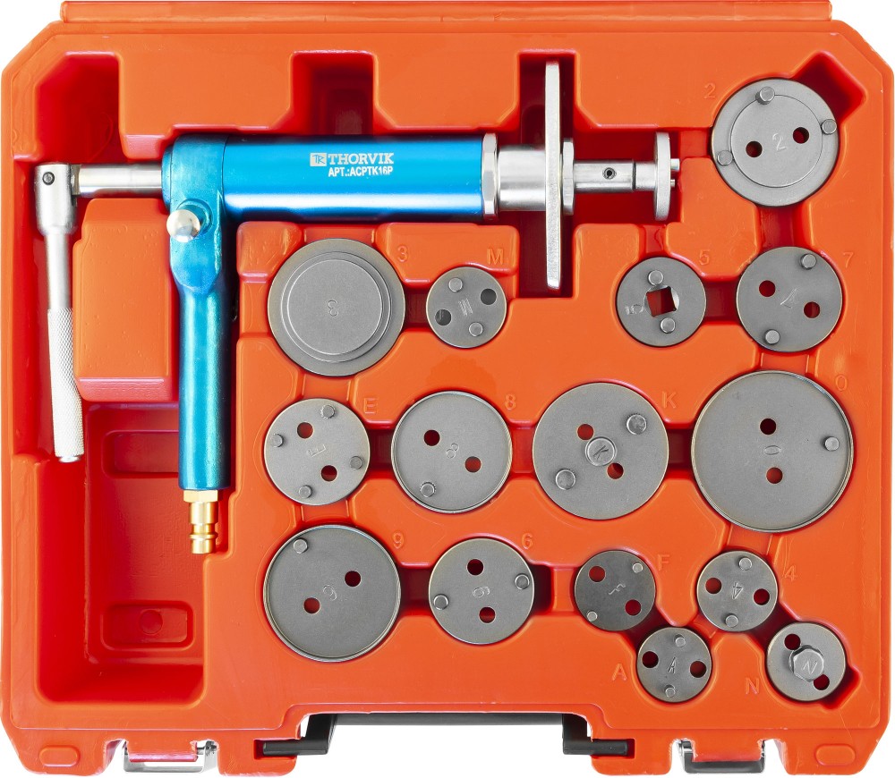 Доставка инструмента Приспособление с пневматическим приводом для возврата поршней дисковых тормозных механизмов в наборе, 16 предметов, THORVIK