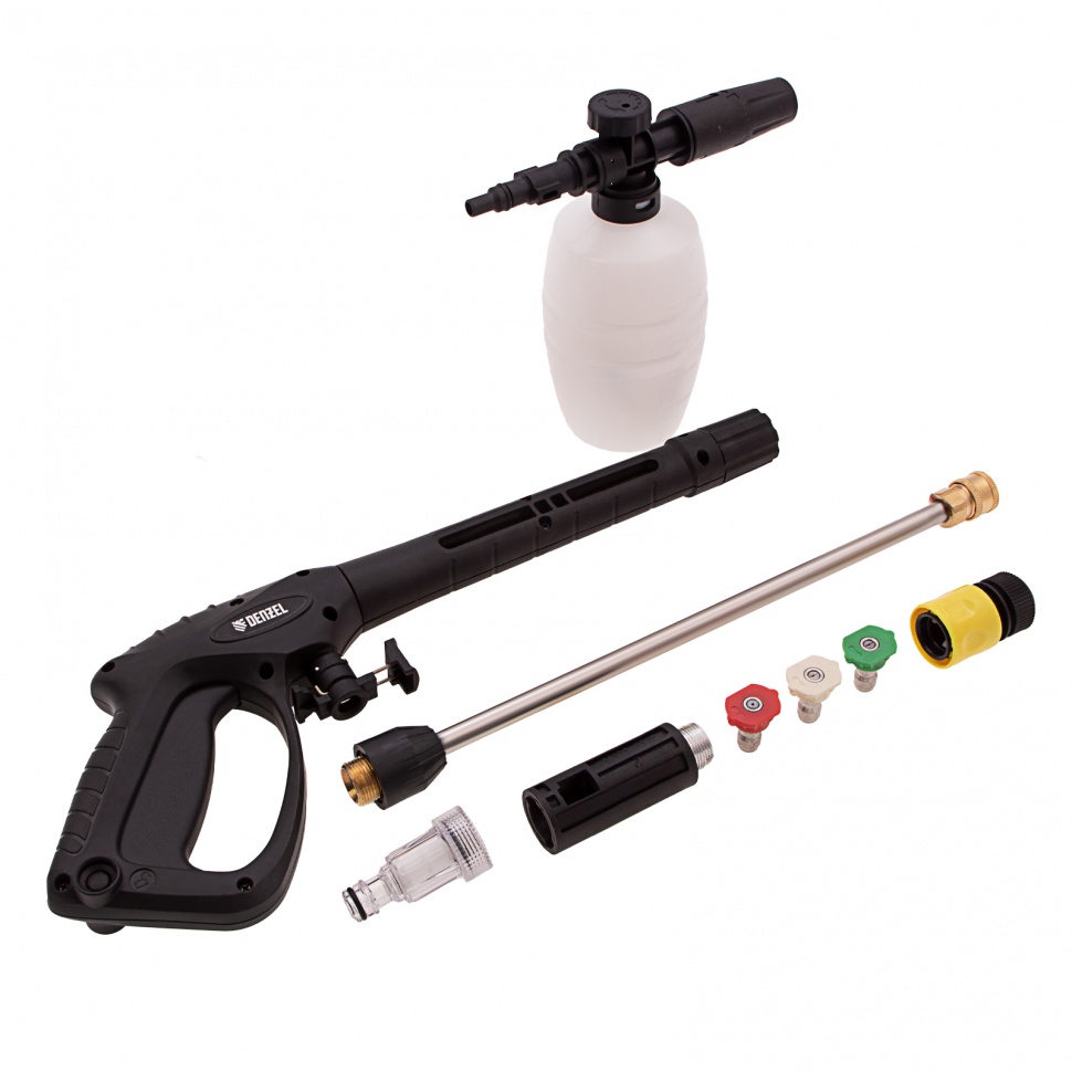 Моечная машина высокого давления Denzel R-210iD 58237 производительностью 8,0 л/мин, с асинхронным двигателем и барабаном для шланга, потребляет 2600 Вт и подает воду под давлением 210 бар. Обеспечивает эффективное очищение автомобилей, заборов, дорожек и садового инвентаря. Благодаря функции самовсасывания мойка может забирать воду из любых емкостей, теряя при этом не более 5% давления, поэтому ее можно использовать при отсутствии доступа к водопроводу.ПреимуществаРабота в труднодоступных местах — быстросъемные форсунки (входят в комплект) позволяют подобрать оптимальный режим, а насадка-удлинитель — мыть рельефные поверхности.Внешний пенокомплект — можно наносить на поверхности моющий раствор для более эффективного очищения.Защита от случайного пуска — производителем предусмотрена блокировка рычага пистолета.Термозащита — автоматическое отключение при перегреве предотвращает поломку двигателя.Надежная конструкция — металлические штуцеры выдерживают даже сильные рывки шланга.Быстрое подключение — HPC-коннектор позволяет легко подсоединять шланг к патрубку мойки.Подготовка к работе за несколько секунд — благодаря быстросъемному коннектору пистолет подключается к шлангу одним движением.Чистая вода — надежный фильтр защищает от засоров и продлевает срок службы помпы.Степень защиты IPX5 — исключено прямое попадание внутрь корпуса воды под любым углом при давлении не более 30 кПа.Электробезопасность — токопроводящие элементы изолированы, предусмотрено заземление (класс защиты I).Мобильность — колеса и телескопическая ручка позволяют легко перемещать мойку во время использования.Комфортная работа — оптимальная длина сетевого кабеля 5 м и увеличенная длина шланга 8 м позволяют свободно перемещаться по рабочей зоне, а чтобы шланг не запутался, его можно быстро намотать на катушку с ручкой.Удобное хранение — мойка оснащена складной ручкой, держателем пистолета и кронштейном под кабель.Гарантия 3 года — качество инструмента подтверждено производителем.
