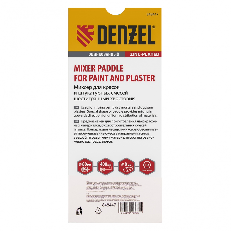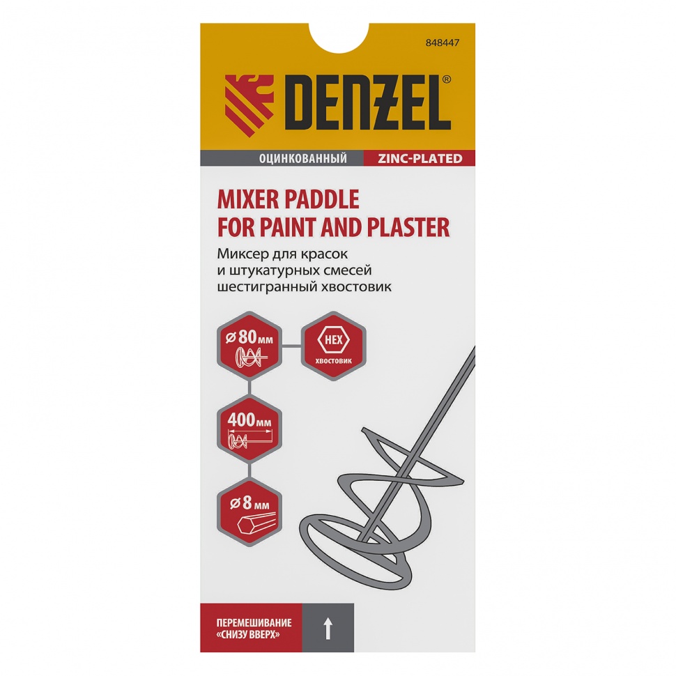 Доставка инструмента Миксер для красок и штукатурных смесей, 80 х 400 мм, оцинкованный, шестигранный хвостовик 8 мм Denzel