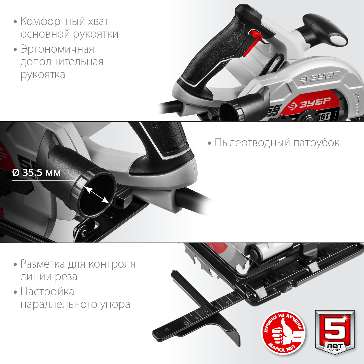 Пила дисковая ЗУБР ПД-55, предназначена для распиловочных работ по дереву и иным материалам (при установке соответствующего диска) под различными углами, а также под наклоном. Имеет небольшой вес, очень компактный с увеличенной мощностью. Двигатель с запасом мощности и редуктор с увеличенным передаточным числом обеспечивают большую производительность и надежность. Диск с твердосплавными напайками и оптимальным количеством зубьев для производительного пиления. Основная и дополнительная рукоятки с мягкими накладками и естественной эргономикой. Усовершенствованная конструкция и точность пиления, современный дизайн и удобство в работе, улучшенные параметры и безопасность оператора являются основой качественного и легкого пиления.