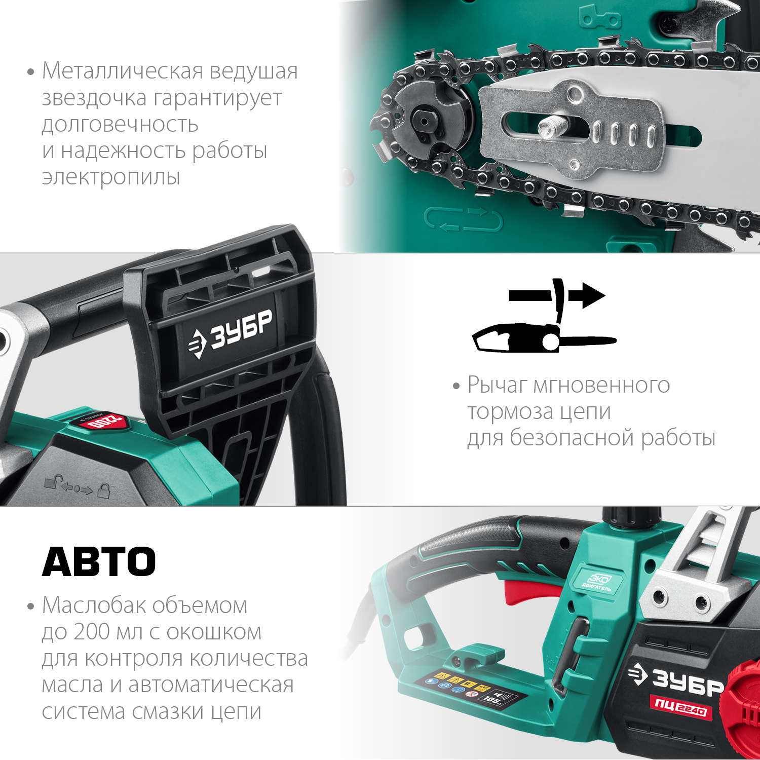Пила цепная ЗУБР ПЦ-2240, применяется для валки деревьев, а так же пиления веток, обрезки сучьев, пиления деревянных балок, досок и т.п. Легкая, эргономичная и удобная пила с простой конструкцией, гарантирующей высокую надежность. Поперечное расположение двигателя упрощает конструкцию и увеличивает надежность передаточного механизма. Система быстрого натяжения полотна способствует ускорению работы и повышению производительности. Мгновенная остановка цепи, приводимая в действие при откидывании защитного щитка, уловитель цепи и клавиша блокировки включения для дополнительной безопасности. Для работы с инструментом дополнительно требуется приобрести масло (рекомендуем ЗУБР ЗМПМ) и удлинитель-шнур (сечение провода не менее 1 мм?).