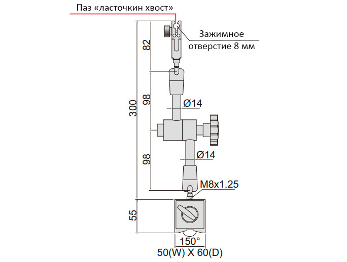 Штатив магнитный гидравлический для индикаторов (измерительных головок). Усилие отрыва магнита 60 кг. Жесткость стойки 0.9 мм/кг. Диаметр отверстия под индикаторную головку d 8 мм, и ласточкин хвост. Высота - 355 мм. Основание - 50x60x55 мм.