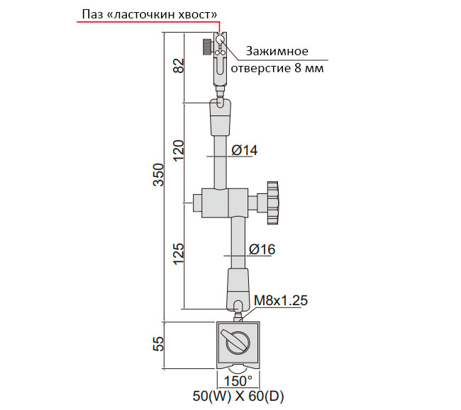 Штатив магнитный гидравлический для индикаторов (измерительных головок). Усилие отрыва магнита 80 кг. Жесткость стойки 1.1 мм/кг. Диаметр отверстия под индикаторную головку d 8 мм, и ласточкин хвост. Высота - 405 мм. Основание - 50x60x55 мм.