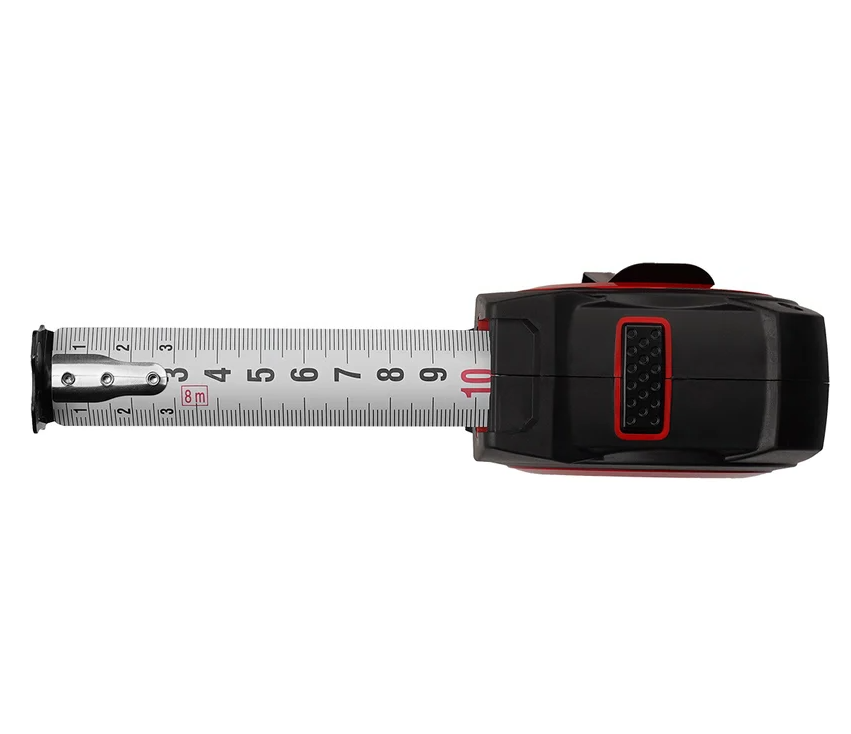 Металлическая измерительная рулетка длиной 8 м, ширина полотна 27 мм, двухсторонняя шкала, сталь с нейлоновым покрытием, II класс точности, магнитный зацеп, автоматическая фиксация полотна.
