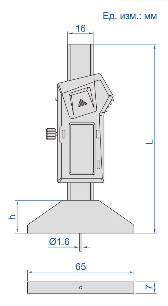 Цифровой мини-глубиномер с круглой линейкой. С измерительной поверхностью рамки в виде продольного выступа и измерительной поверхностью штанги в виде плоской прямоугольной поверхности основания.