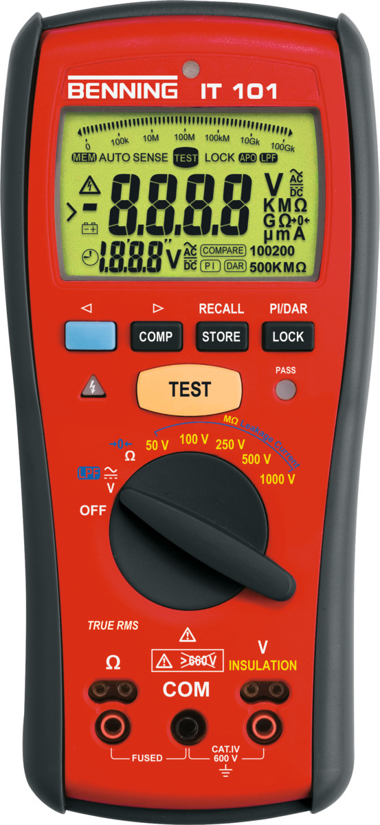 <h3>Исполнение:</h3> <div>Прибор для измерения сопротивления изоляции и низкоомных измерений <b>электрических установок, приборов, проводов, двигателей и генераторов.</b></div> <h3>Функция:</h3> <div>Ток утечки, коэффициент поляризации (PI), коэффициент поглощения (DAR), автоматическая функция разрядки, коррекция нуля измерительных проводов.</div> <h3>Применение:</h3> <div><b>Измерения:</b> в частности, низкоомные, сопротивления изоляции (испытательное напряжение: 50 В, 100 В, 250 В, 500 В, 1000 В) и расчёт тока утечки, сопротивления испытательным током 200 мА для контроля соединений защитных проводов, коэффициента поляризации, диэлектрического коэффициента поглощения, напряжения, сопротивления.<br><b>Особенности:</b> возможность выбора предельных значений для измерения по ISO, зелёный светодиод для подтверждения соответствия заданным параметрам, красный светодиод для испытательного / внешнего напряжения, переключаемый измерительный наконечник для запуска измерения, встроенная память на 100результатов измерения на каждую измер. функцию, автоматическая разрядка емкостных напряжений, коррекция нуля измерительных проводов, функция блокировки.</div> <h3>Объем поставки:</h3> <div>Включая футляр, измерительные провода, зажимы, переключаемый измерительный наконечник, защитную резиновую рамку, 4 элемента питания № 081556 разм. LR6.</div>