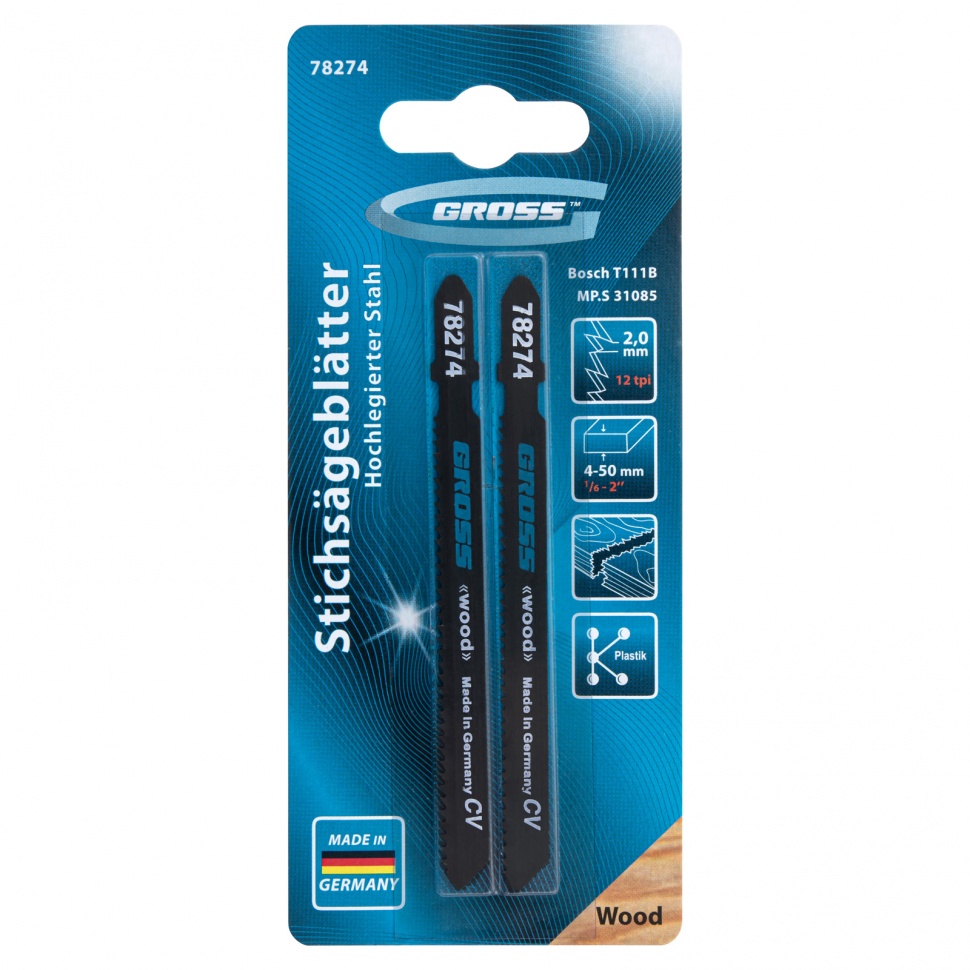 Полотна для электролобзика по дереву Gross 78274, 2 шт. (31085 - T111B), используются для работы с древесиной мягких и твердых пород, ДСП, ДВП и композитных материалов на основе древесины. Они рассчитаны на профессиональное применение, пригодятся при проведении строительных и ремонтных работ. За счет рабочей длины 75 мм и толщины 1 мм полотна способны распилить заготовки толщиной 4-50 мм.Преимущества Долгий срок службы — полотна из хромованадиевой стали отличаются высокой твердостью и износостойкостью. Высокая точность работ — отшлифованные под конус боковые поверхности полотен и зубья с шагом 2 мм повышают качество реза, оставляя на месте распила ровную кромку. Удобное и безопасное хранение — полотна упакованы в жесткий блистер.