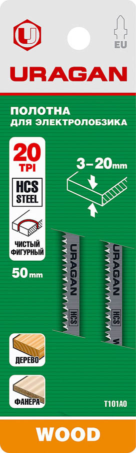 Доставка инструмента Полотно для эл/лобзика по дереву, фанере, фигурный рез, EU-хвостовик, шаг 1.4 мм, 75/50 мм, 2 шт, HCS URAGAN
