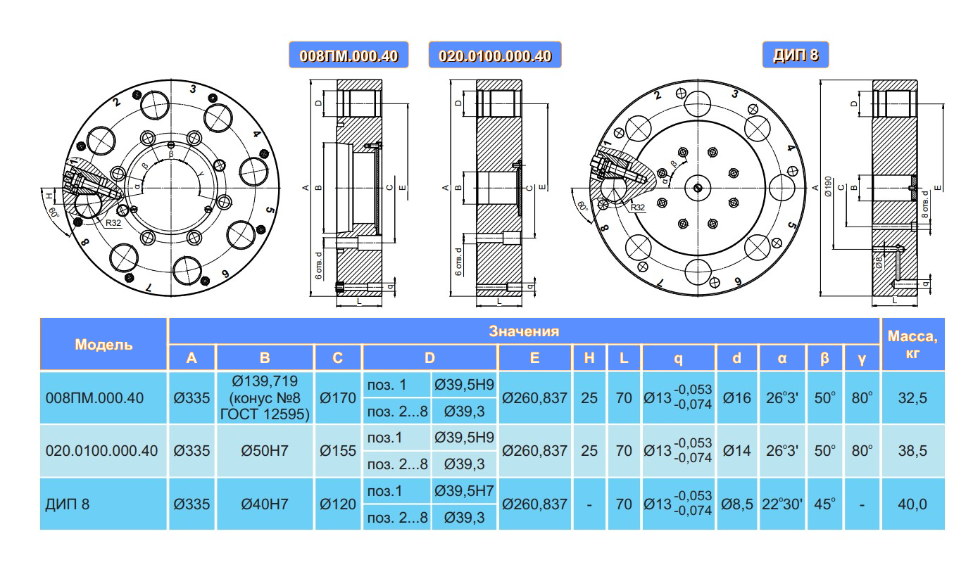 Диски инструментальные восьмипозиционные 008ПМ.000.40, 020.0100.000.40, ДИП 8 предназначены для установки резцедержателей с цилиндрическим хвостовиком диаметром 40 мм по ГОСТ 24900 (ISO 10889).