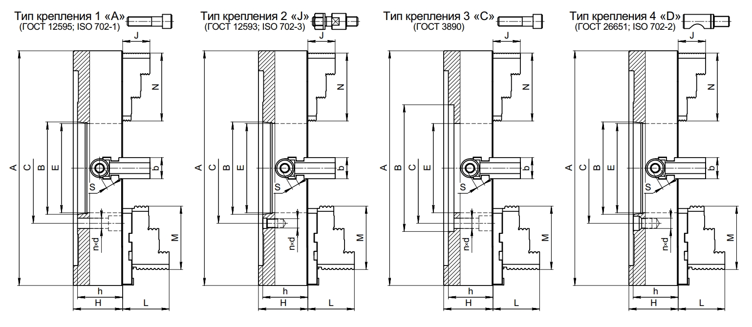 Корпус патронов выполнен из стали диаметром от 250 до 1000 мм и оснащен Т-образными пазами согласно стандарту ГОСТ 1574, предназначенными для монтажа различных приспособлений и инструментов.