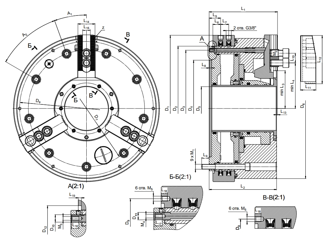 Ключевая особенность конструкции — встроенный пневмопривод, который даёт возможность монтировать два патрона одновременно (на передней и задней частях шпинделя). Такое решение существенно повышает точность центрирования трубной заготовки. Для подключения к системе подачи сжатого воздуха патрон оснащается коллектором, монтируемым на передней бабке станка.
