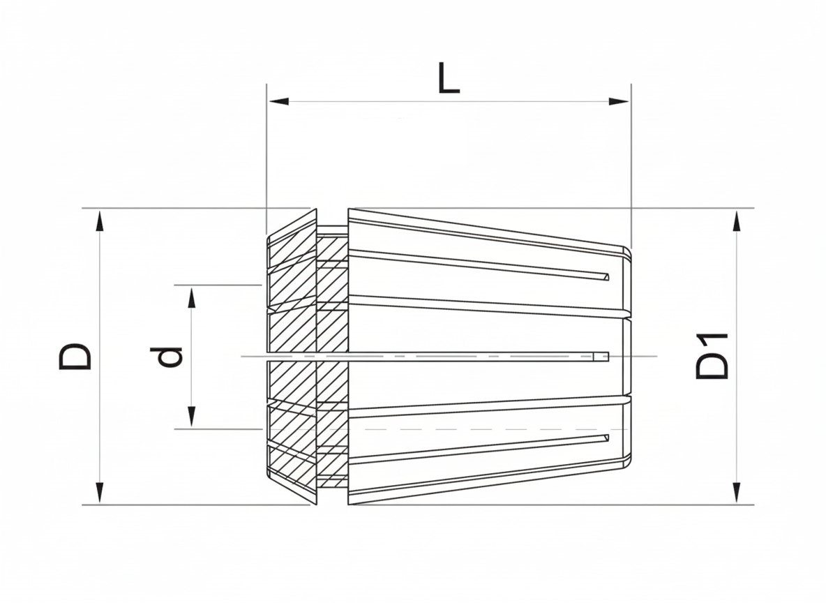 Высокоточная цанга серии ER соответствует стандартам DIN 6499B и ISO 15488-B. Изделие предназначено для надежного и стабильного зажима режущего инструмента в соответствующих патронах, обеспечивая высокую точность обработки и минимальное радиальное биение.