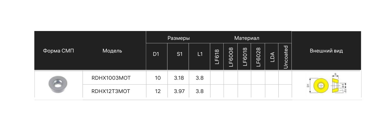 RDHX12T3MOT TF618 фрезерная пластина Boro Deskar - сменная твердосплавная пластина RDHX по металлу предназначена для обработки материалов по ISO: PMKS.