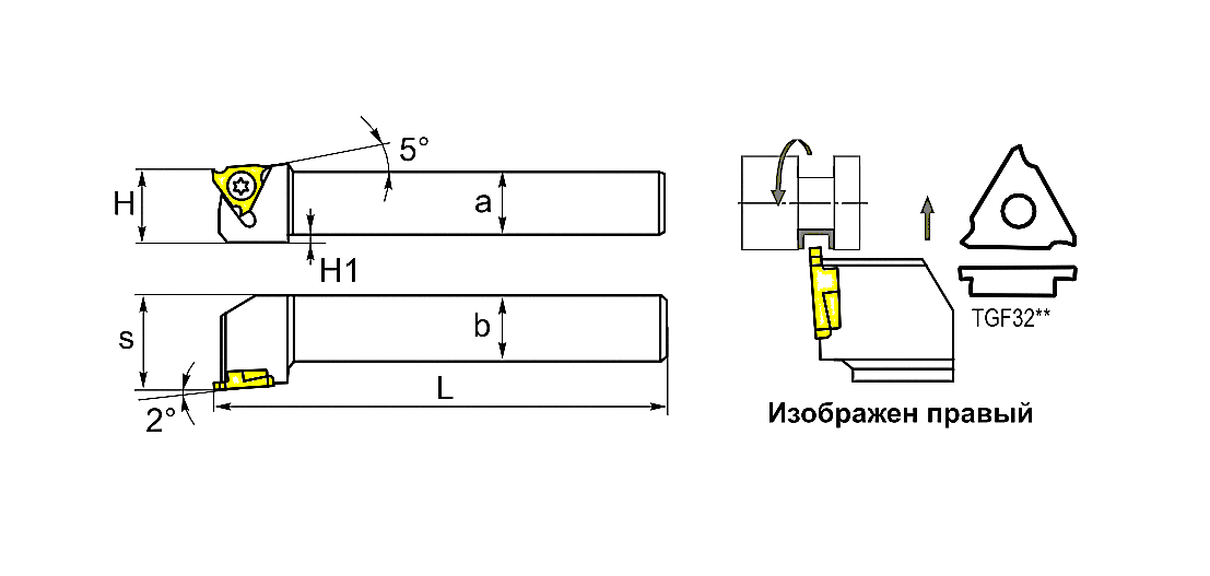 TKGFR2020K16 державка для обработки наружных канавок Deskar с сечением 20х20мм используется с режущими пластинами TGF32R** (размер: 16) для обработки металла.