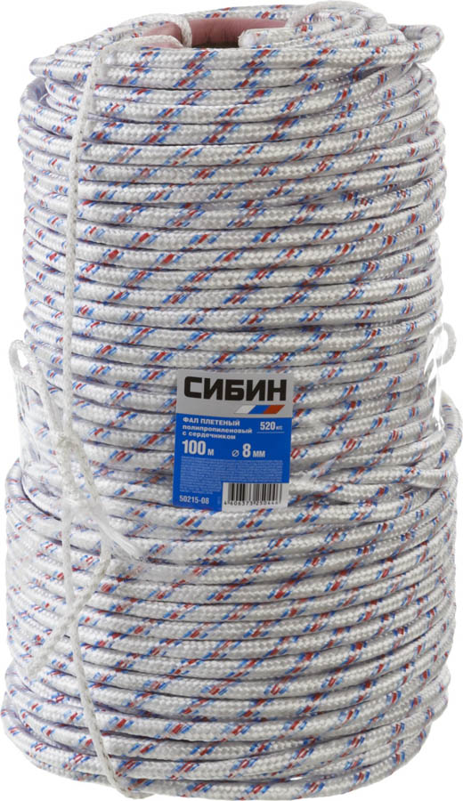 Как купить Фал плетёный полипропиленовый с сердечником СИБИН 50215-08 100 м, 8 мм, 16-прядный, 520 кгс, ?