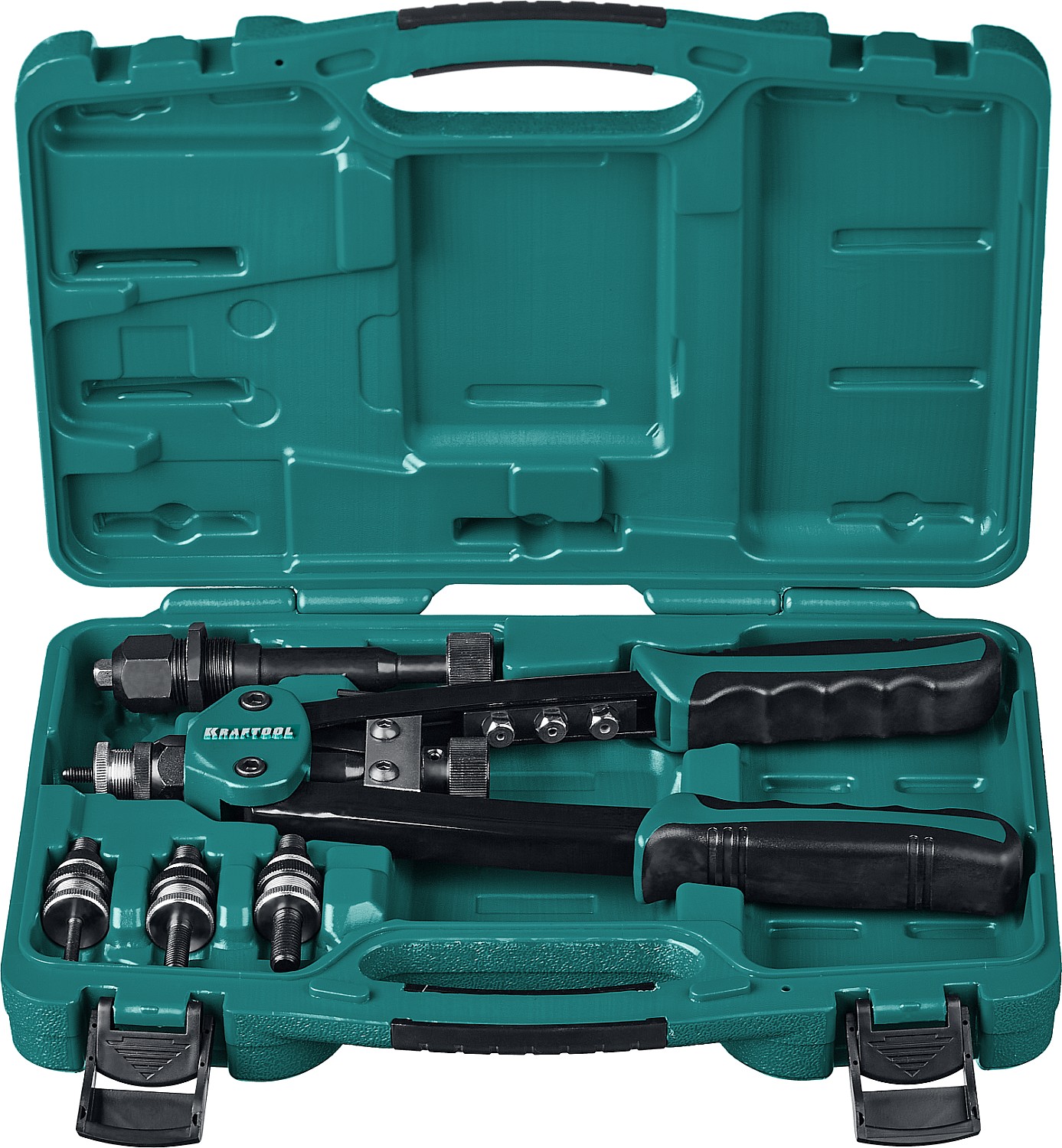 Заклепочник KRAFTOOL 31181, предназначен для установки резьбовых и вытяжных заклепок из алюминия, стали и нержавеющей стали. Рычажная конструкция инструмента многократно увеличивает приложенные усилия.