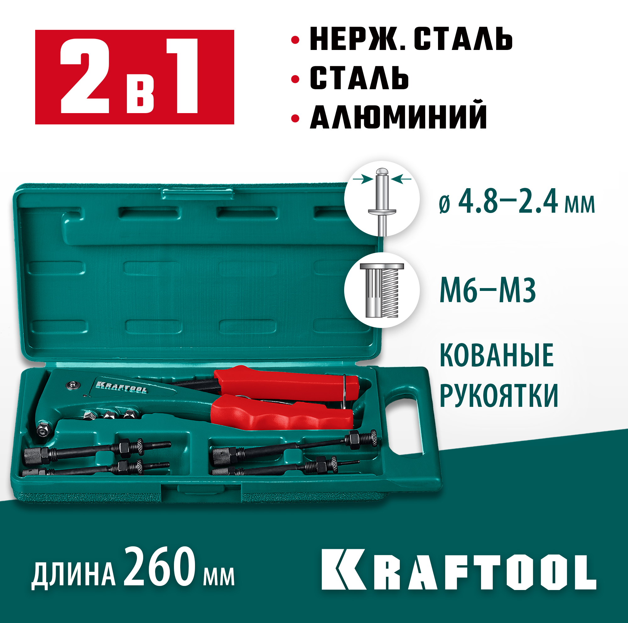 Заклепочник KRAFTOOL 31180, предназначен для создания неразъемных соединений из различных материалов. Комбинированный заклепочник выдерживает высокие рабочие нагрузки. Имеет повышенную прочность благодаря кованым рукояткам.