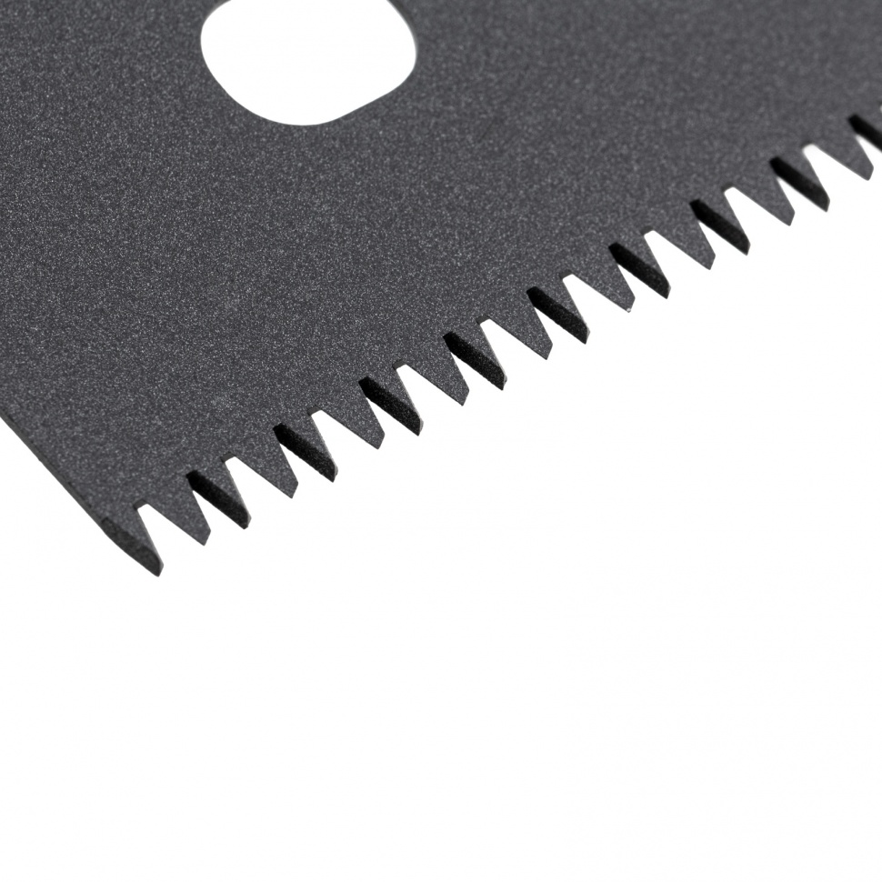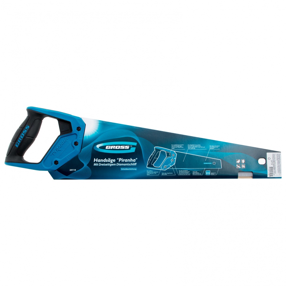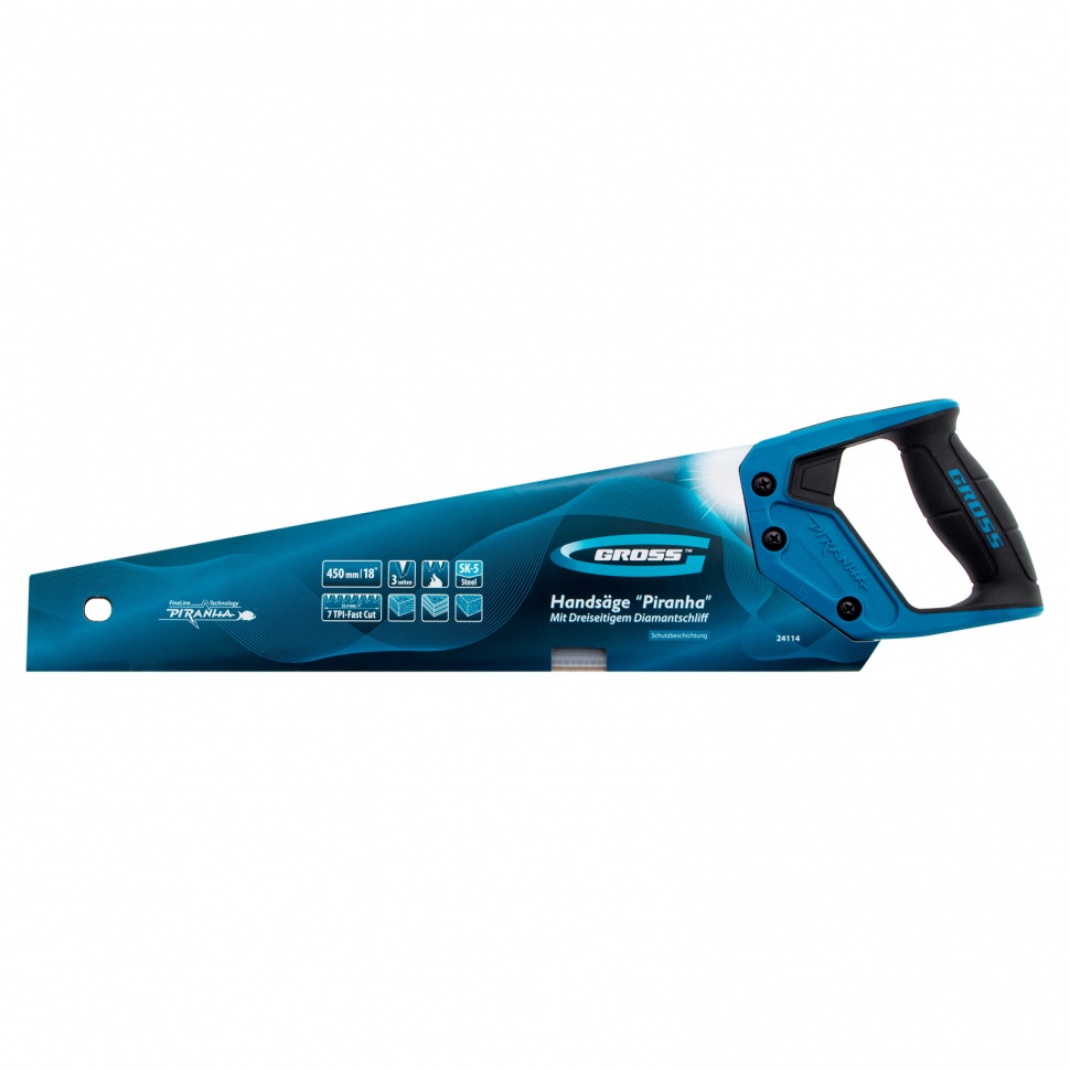 Ножовка по дереву Gross PIRANHA 24114 с полотном длиной 450 мм, калеными зубьями с 3D-заточкой и шагом 7 TPI, с тефлоновым покрытием полотна и 2-компонентной рукояткой, используется для продольного и поперечного распиливания древесины различных пород, МДФ, ДСП, ДВП, ламината, а также пенополистирола, полиуретана и других синтетических материалов. Рабочая часть состоит из крупных зубьев поэтому ножовка подходит для решения широкого спектра задач. Трехгранная заточка зубьев увеличивает производительность инструмента без потери качества распиловки. Ножовка предназначена для столярных работ.ПреимуществаПолотно изготовлено из японской пружинной стали SK-5, поэтому характеризуется высокой прочностью и устойчивостью к нагрузкам.Зубья прошли закалку токами высокой частоты и устойчивы к износу, поэтому рабочая кромка долго сохраняет режущие свойства.Поскольку основание зубьев не закалено на максимум, снижается вероятность их слома при пилении твердых материалов или попадании на металлический предмет.На поверхность полотна нанесено тефлоновое покрытие, защищающее инструмент от коррозии и увеличивающее срок его службы.Тефлоновый слой улучшает скольжение полотна, что упрощает распиловку.Двухкомпонентная рукоятка выполнена из ударопрочного ABS-пластика, что повышает надежность ножовки.Рукоятка имеет эргономичную форму и рельефный дизайн, поэтому не скользит в руке и снижает усталость во время длительной работы.Ножовка изготовлена в Тайване по классической технологии и обладает гарантированно высоким качеством.