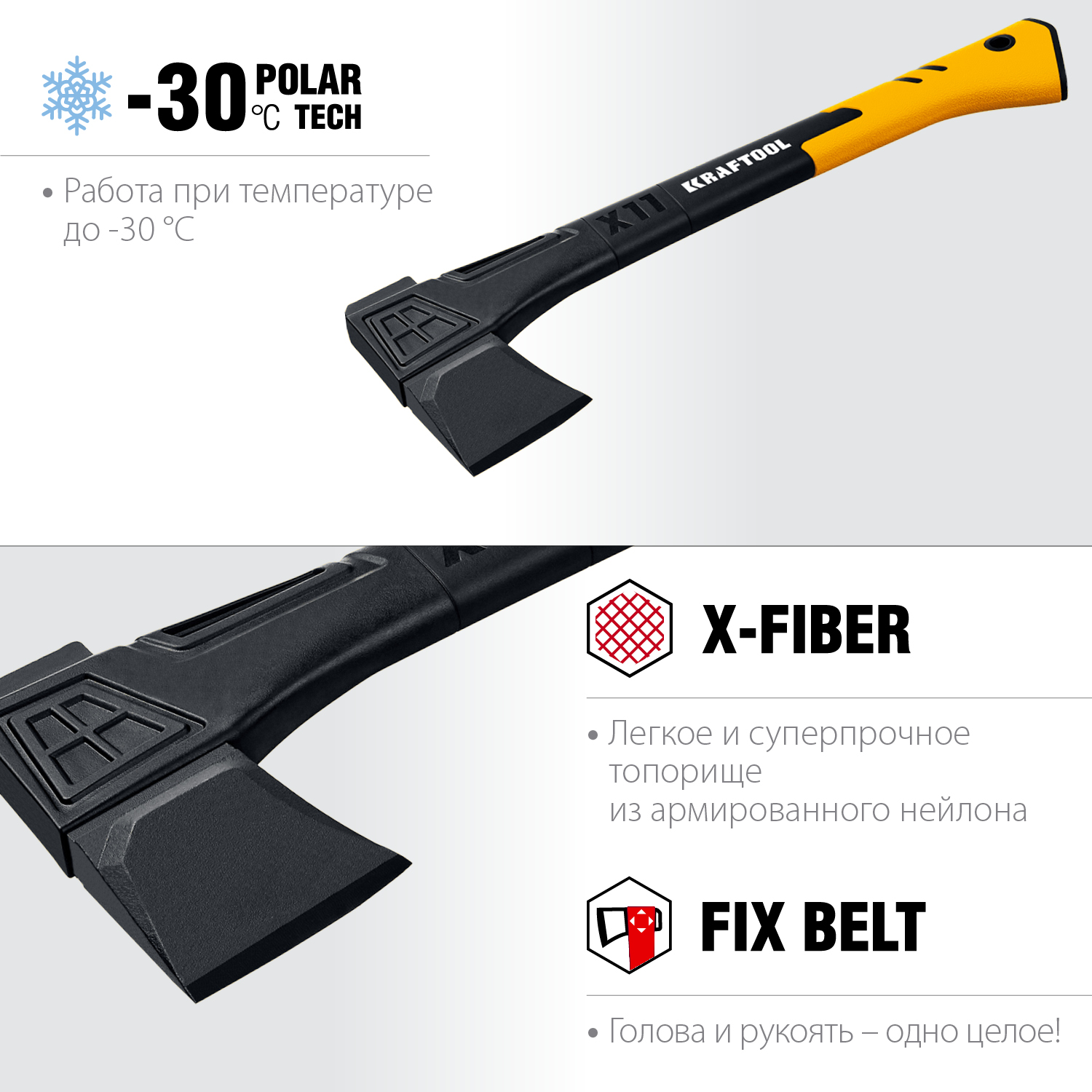 Топор колун KRAFTOOL 20660-11, предназначен для раскалывания древесины различных пород. Топор финского типа с рукояткой из армированного нейлона X-Fiber с технологией фиксации головы FixBelt и морозоустойчивой технологией PolarTech - профессиональный инструмент для рубки, колки и тески древесины при агрессивных погодных условиях, морозоустойчивость до -30С.