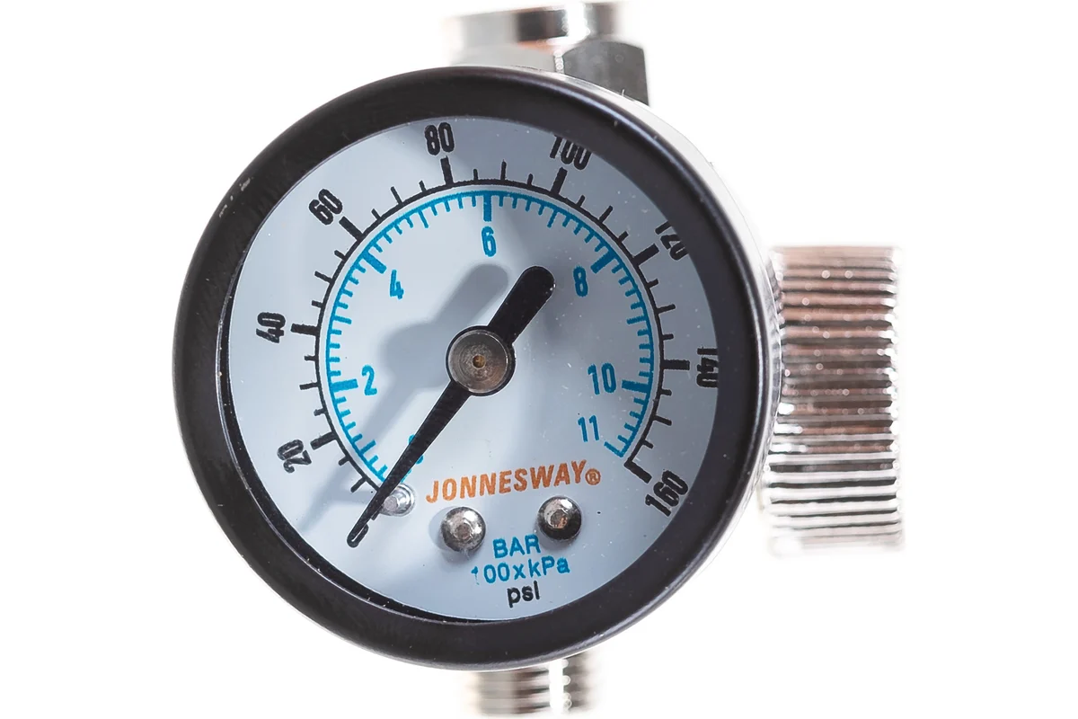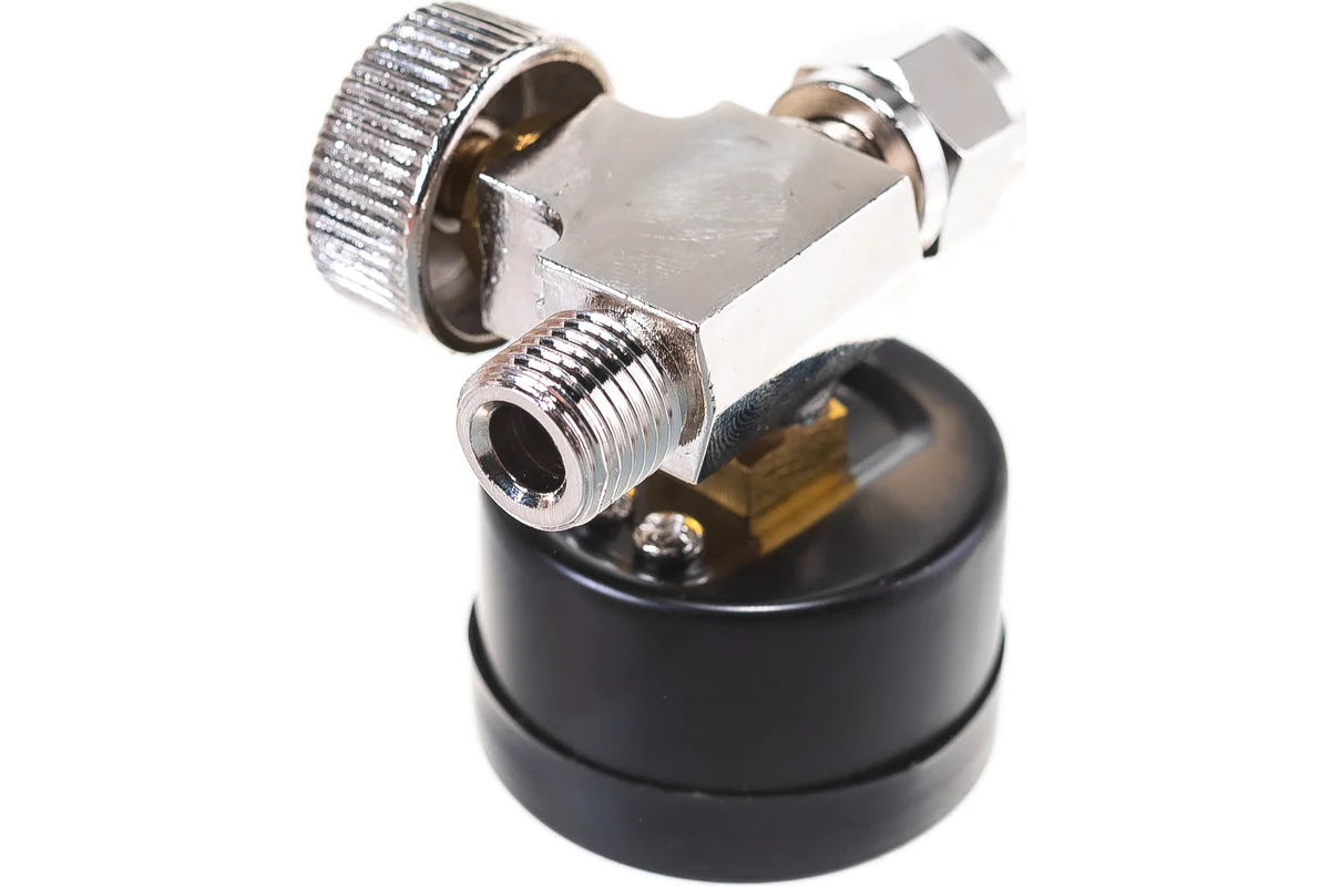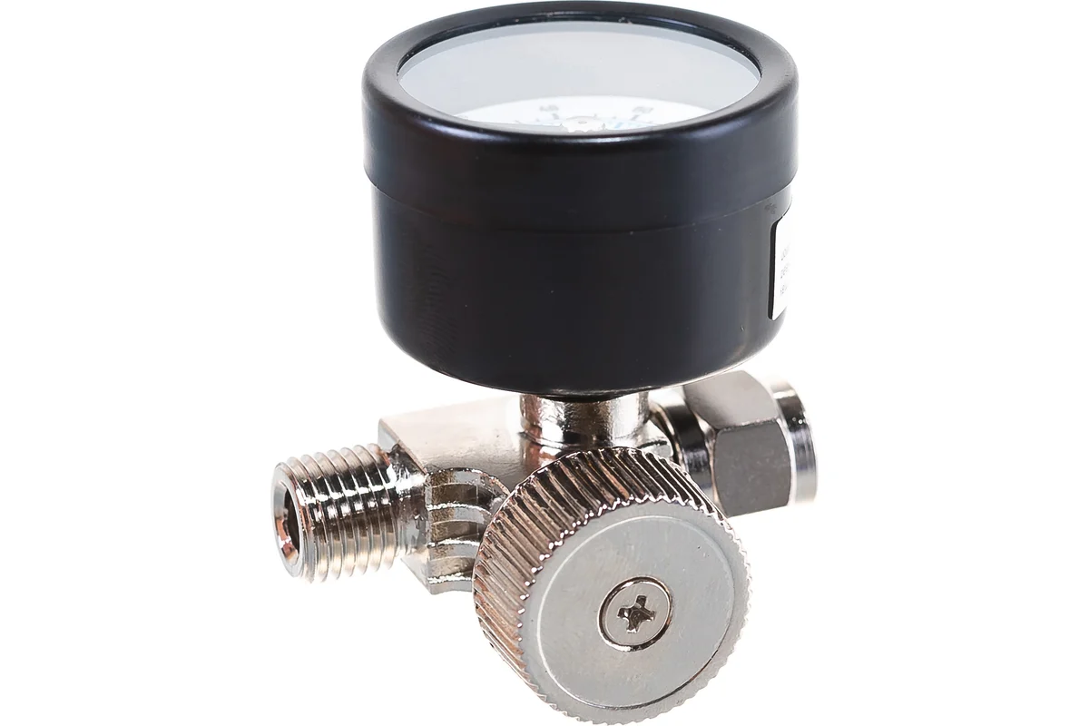 Компактное устройство, применяющееся для контроля и регулировки давления воздуха, поступающего к пневматическому инструменту в диапазоне значений давления от 0 до 10 кгс/см?. Регулятор устанавливается непосредственно на рукоятку инструмента с помощью резьбового штуцера. Размер резьбовой части 1/4’’PT.