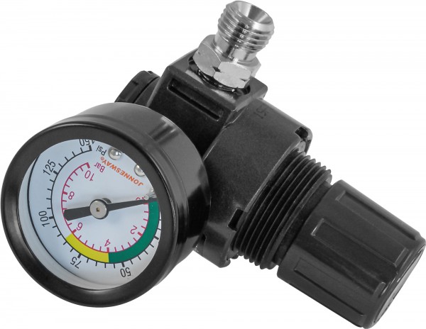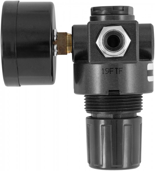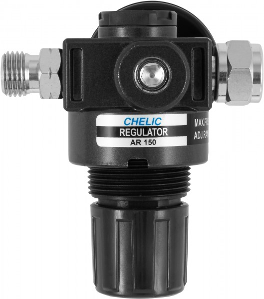 Устройство применяется для контроля и регулировки давления воздуха, поступающего к покрасочному пистолету, работающему в диапазоне значений давления воздуха не выше 0-10 кгс/см?. Регулятор устанавливается непосредственно на рукоятку покрасочного пистолета с помощью резьбового штуцера. Размер резьбовой части 1/4’’PT.