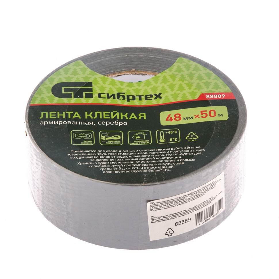Лента клейкая армированная, 48 мм x 50 м, серебро Сибртех, арт: 88889