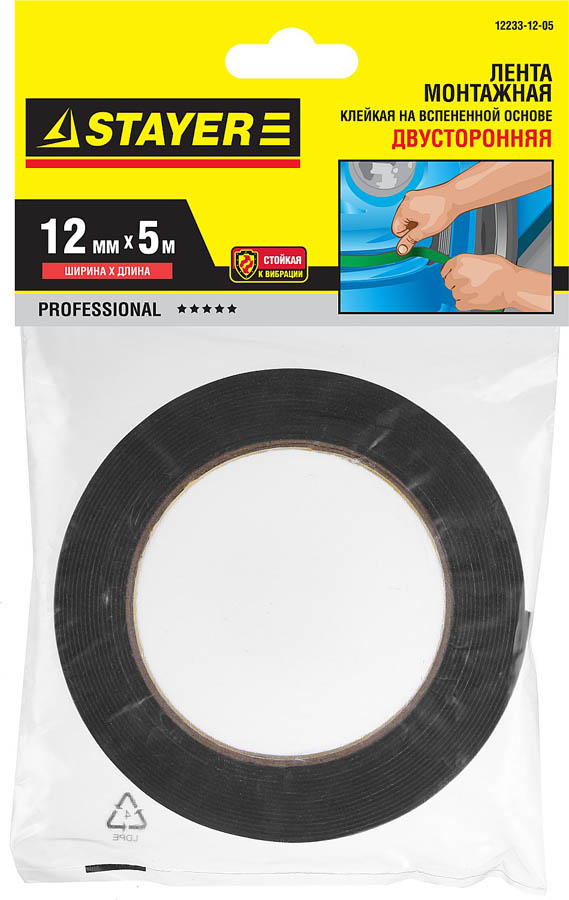 Двусторонняя клейкая лента STAYER 12233-12-05, предназначена для монтажа автомобильных зеркал, молдингов и элементов внутренней облицовки автомобилей. Также применяется для монтажа различных типов изделий, подверженных вибрационным нагрузкам и сдвигам, например, настенных держателей, вешалок и крючков. Обладает высокими показателями клейкости даже при использовании с неполярными поверхностями, такими как полиэтилен и полипропилен. <br> Подходит для работы с такими материалами, как ПВХ, полистирол, дерево, стекло, керамика. Лента позволяет быстро, легко и качественно соединять различные типы поверхностей, не портя их сверлением отверстий или нанесением клея. <br> Мягкая и гибкая вспененная основа обеспечивает надежное сцепление даже с неровными и структурированными поверхностями. Лента отличается долговечностью, стойкостью к УФ-излучению, воздействию погодных условий, воды, моющих средств и спиртов.