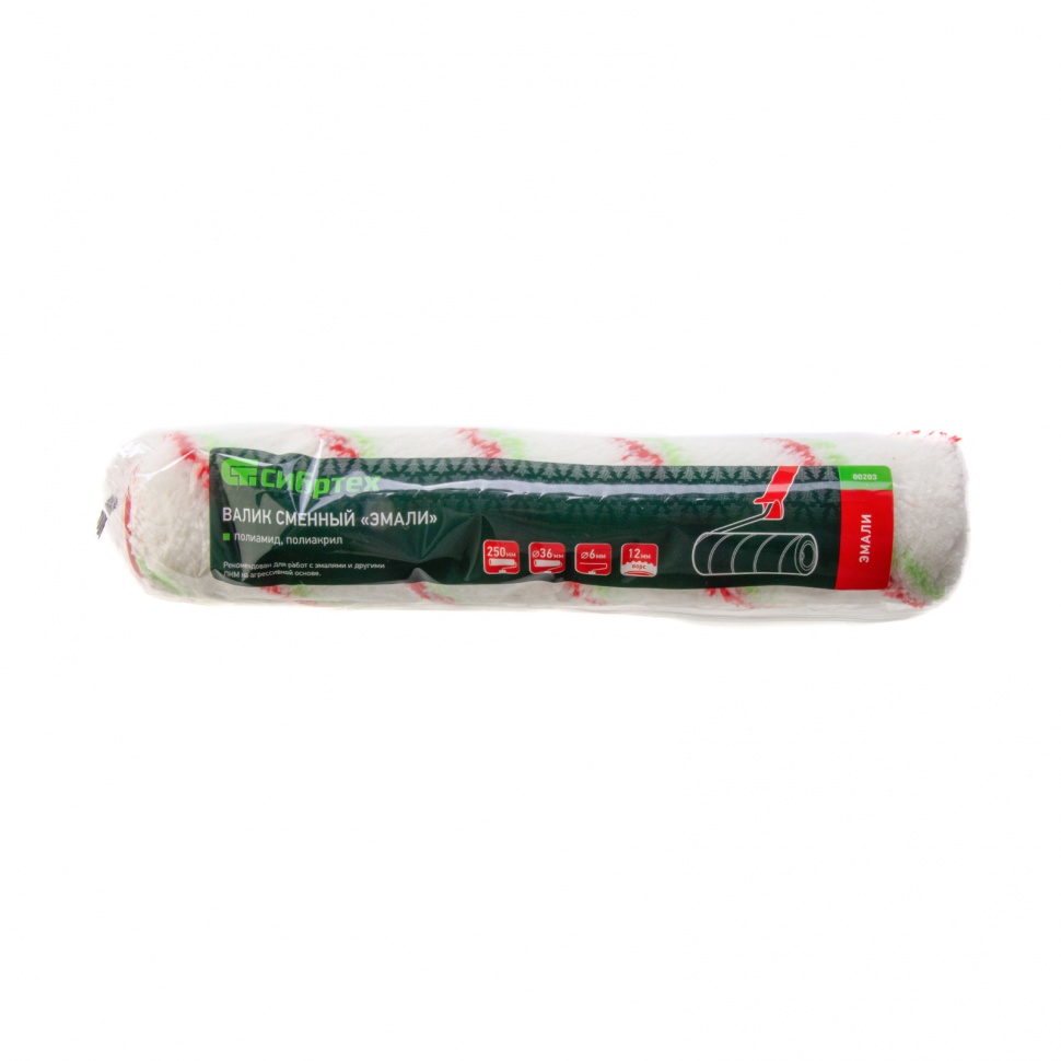 Сменный валик Сибртех «Эмали» 80203 с ворсом 12 мм из полиамида и полиакрила, размером ролика 250 х 36 мм, под ручку 6 мм, подходит для проведения малярных работ с любыми типами лакокрасочных материалов, даже содержащих агрессивные вещества. За счет ворса средней длины подходит для поверхностей любого типа. Рекомендован для работ с эмалями.ПреимуществаЭффективная работа — валик хорошо прокрашивает даже неровные поверхности, не оставляя ворса.Прочность и износостойкость — шубка с добавлением полиамидного волокна надежно зафиксирована на ролике термическим методом.Быстросъемная конструкция — ролик легко снимается для очистки и замены, что экономит время мастера.Равномерное нанесение краски — шубка выполнена без шва, а ее края обработаны, поэтому валик не оставляет следов на окрашиваемой поверхности.Ширина 250 мм — валик позволяет быстро окрашивать большие участки.Высококачественное исполнение — применение новейшей технологии Termofusion Coinjection при производстве валика позволяет увеличить срок его службы и обеспечивает эффективное окрашивание.