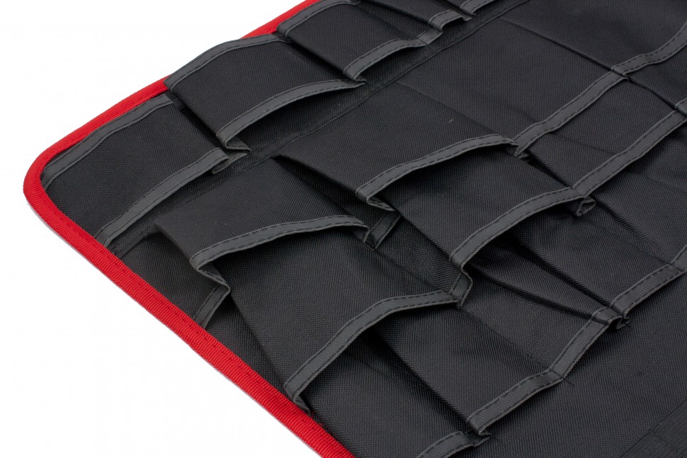 Настенная раскладка для инструмента Matrix 90245, 675 х 450 мм, предназначена для организации хранения слесарных, монтажных и других принадлежностей. Благодаря ей все инструменты будут храниться на своих местах и не потеряются. Разместить раскладку очень просто — она вешается на стену на установленные в материале люверсы. Будет полезна дома, на даче и в гараже.ПреимуществаРаскладка изготовлена из прочной ткани оксфорд, поэтому устойчива к износу и легко чистится.З8 карманов позволяют разместить инструменты разного размера и формы.В верхней части имеется резинка, что удобно для фиксации длинных предметов.