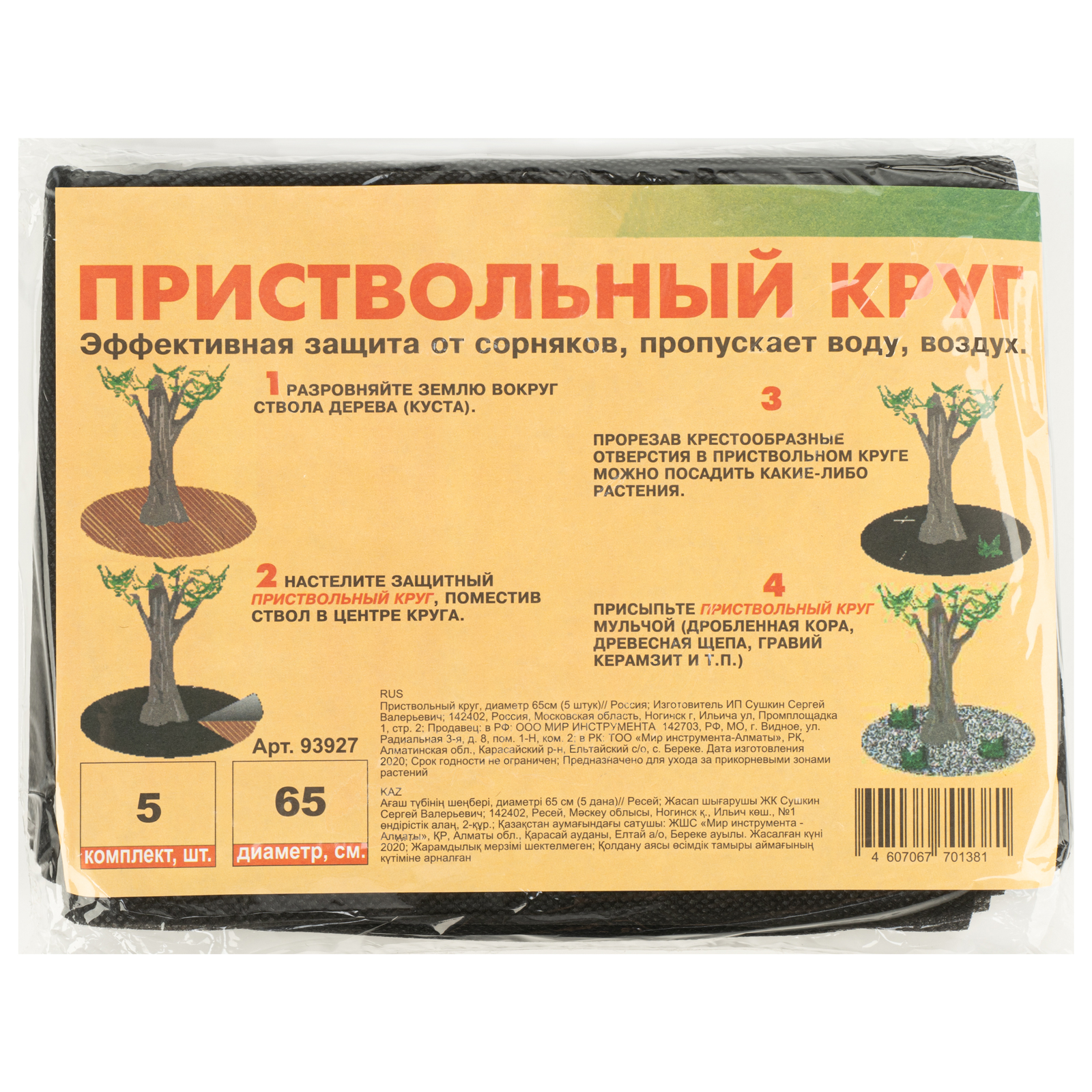 Приствольный круг 93927 диаметром 65 см, 5 шт. в упаковке, предназначен для ухода за деревьями. Круг позволяет обозначить околоствольное пространство, необходимое для надлежащего питания и дыхания корневой системы растения. Материал круга — экологически чистый полипропилен, поэтому он безвреден для окружающей среды. Пригодится владельцам дачных участков.ПреимуществаИзготовлен из нетканого материала плотностью 60 мкм, свободно пропускающего воздух и влагу, поэтому можно осуществлять полив, не убирая круг.Предотвращает вымывание из почвы удобрений и полезных микроэлементов, обеспечивая надлежащее питание корневой системы.Препятствует росту сорняков, способствуя нормальному развитию дерева.Окрашен в черный цвет, поэтому почва под ним быстрее прогревается.Поставляется в удобной упаковке из 5 шт.