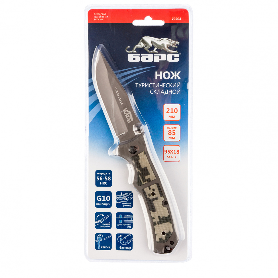 Складной туристический нож Барс 79204, 210мм/85мм, с системой Liner-Lock, накладкой G10 на рукоятке, находит широкое применение при активном отдыхе на природе, на рыбалке и охоте. Встроенный механизм Liner-Lock позволяет быстро раскрывать нож одной рукой.ПреимуществаВысокий ресурс и коррозионная стойкость — лезвие ножа выполнено из стали 95Х18 твердостью 56-58 HRC с титановым покрытием.Безопасность эксплуатации — двусторонний упор и рукоятка с многослойной накладкой G10 из стеклотекстолита предотвращают соскальзывание руки на лезвие.Удобная транспортировка — нож оснащен клипсой для фиксации на ремне.