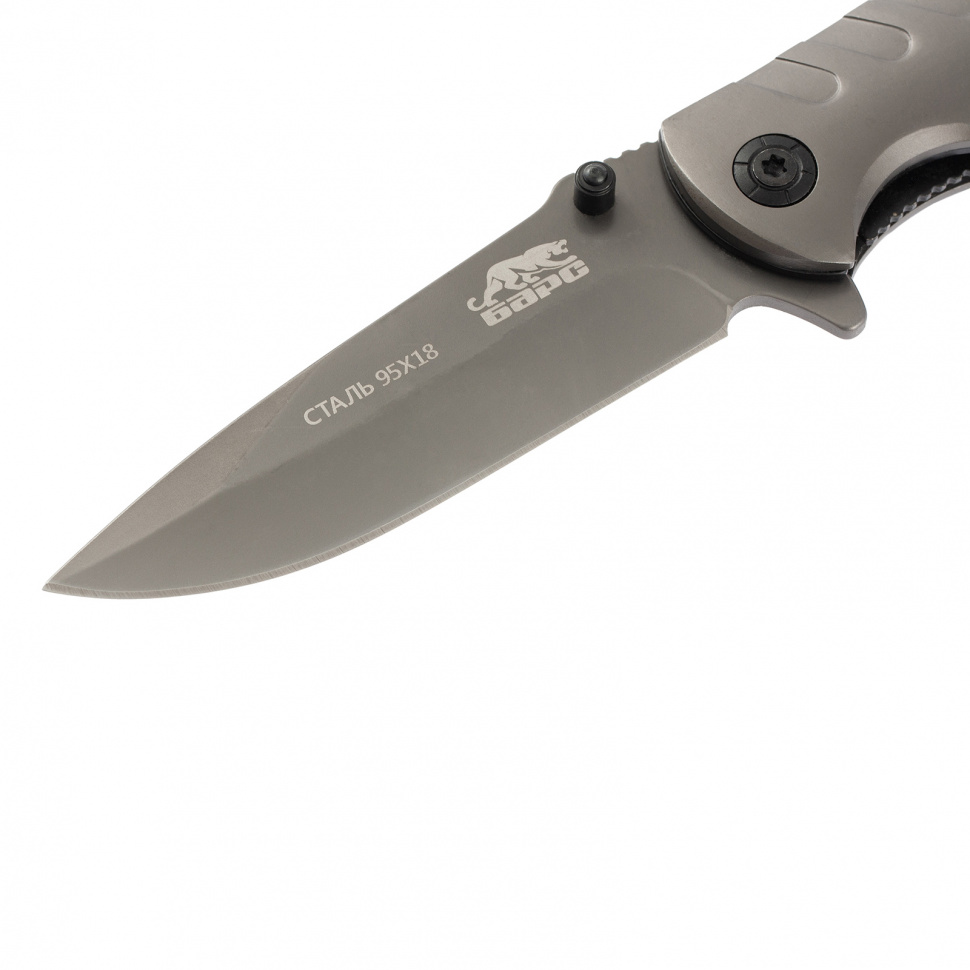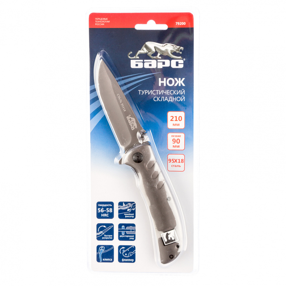 Туристический складной нож Барс 79200 длиной в рабочем состоянии 210 мм, с лезвием 90 мм, металлической рукояткой и системой Liner-Lock, пригодится любителям активного времяпрепровождения на природе, в том числе рыбакам и охотникам. Механизм Liner-Lock позволяет мгновенно извлекать лезвие одной рукой.ПреимуществаПрочность и долговечность — лезвие ножа выполнено из коррозионностойкой стали с титановым покрытием.Высокий ресурс — режущая кромка твердостью 56-58 HRC долго не нуждается в заточке.Безопасная эксплуатация — двойной фиксатор надежно удерживает нож раскрытым, а цилиндрический двусторонний упор препятствует соскальзыванию пальцев на лезвие.Удобная транспортировка — конструкцией предусмотрена клипса для крепления на ремне или кармане.