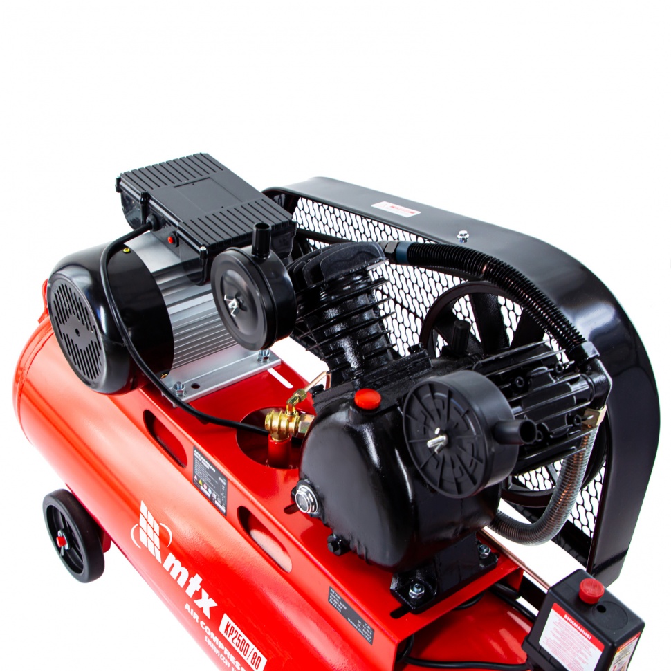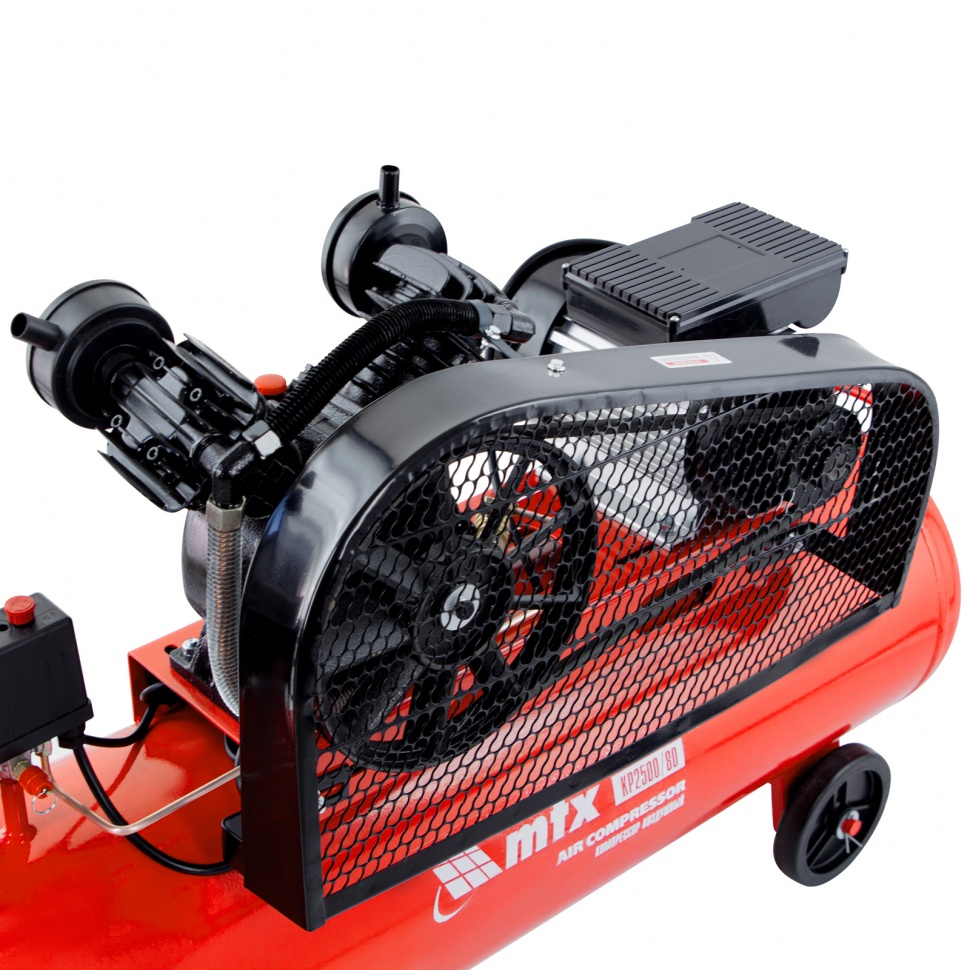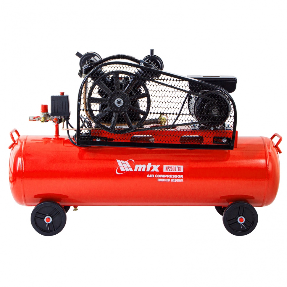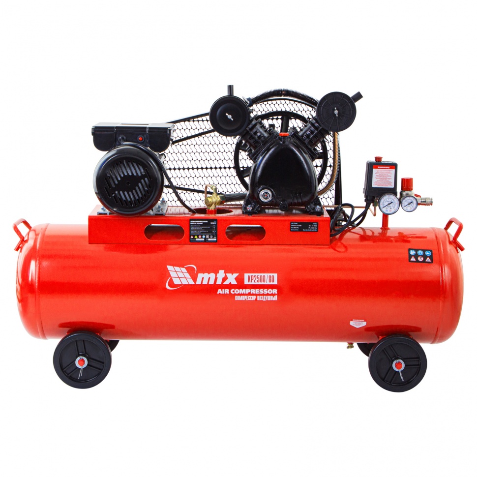 Компрессор воздушный МТХ КР2500/80 58047 с ременным приводом от электродвигателя, мощностью 2,5 кВт и производительностью 420 л/мин, с ресивером объемом 80 литров, применяется для подачи сжатого атмосферного воздуха в пневматические инструменты. К нему можно подключать гайковерт, дрель, степлер, краскопульт, продувочный пистолет и т.п.ПреимуществаБезопасность — защита от перегрузки позволяет избежать аварийные ситуации.Защитный клапан — превышение максимально допустимого давления в ресивере исключено.Реле давления — автоматическая регулировка работы с помощью периодических остановок/запуска двигателя позволяет поддерживать стабильную производительность.Повышенный ресурс — чугунный блок цилиндра увеличивает срок эксплуатации компрессора.Увеличенная емкость масляного картера — все детали воздушного компрессора обеспечены достаточной смазкой.Оснащение двумя манометрами — устройства позволяют контролировать давление сжатого воздуха в воздухосборнике и в пневмомагистрали.Простая подготовка к работе — с помощью быстросъемного коннектора пневмооборудование легко подключить.Мобильность — для удобного перемещения компрессор оснащен колесами и ручкой.Низкий уровень шума — значение звуковой мощности не превышает 95 дБ.Готовность к работе — комплект крепежа, колеса, сапун и компрессорное минеральное масло марки DAA100 (500 мл) входят в комплект поставки.