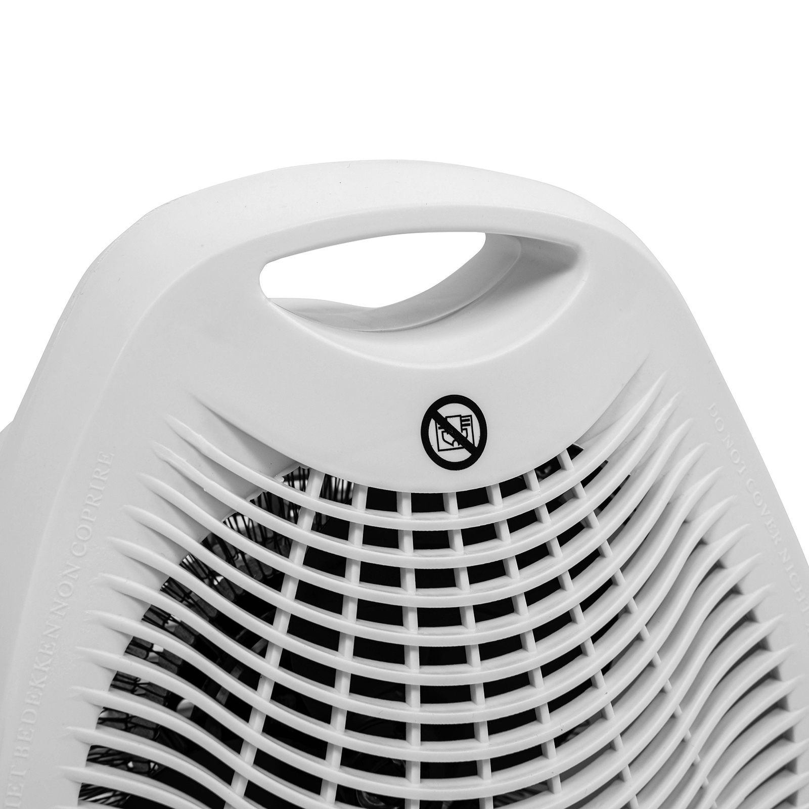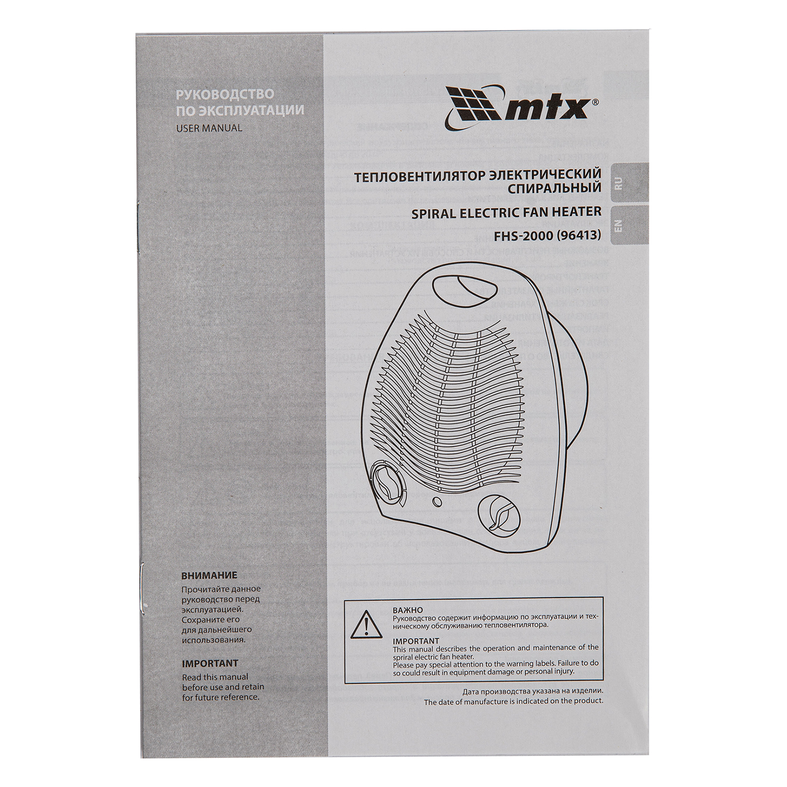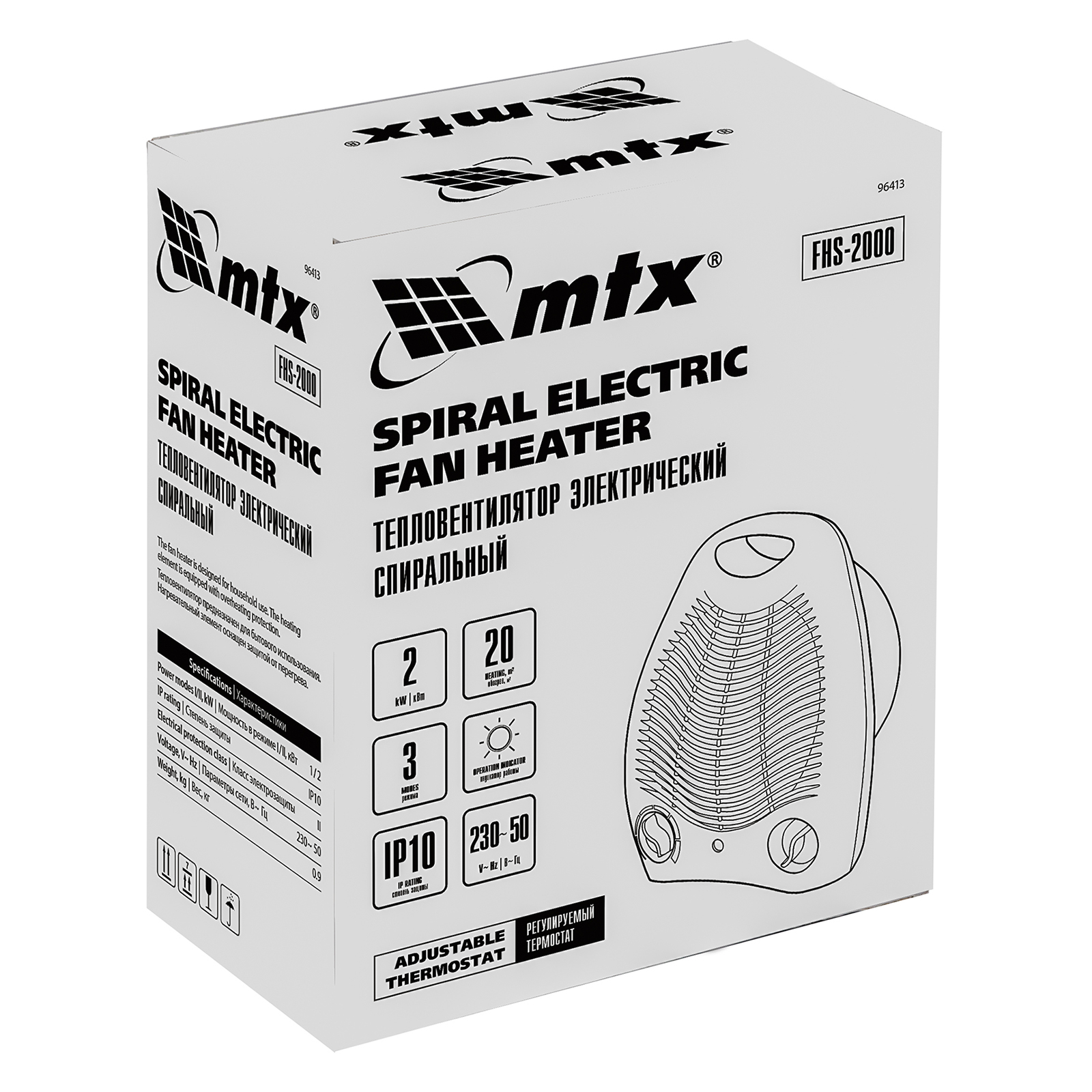 Электрический тепловентилятор MTX FHS-2000 96413 мощностью 1000/2000 Вт, с нагревателем спирального типа и вентилятором, имеет 3 режима работы и используется для обогрева комнат площадью до 20 кв. м в квартире или на даче. Его можно применять для поддержания необходимой температуры в помещении в холодную погоду, а также для вентиляции в жару. Устройство устанавливают на полу или на столе, управление осуществляется при помощи 2 механических переключателей.ПреимуществаУдобная регулировка — можно установить один из трех режимов работы: вентиляция (без нагрева), теплый воздух (потребляемая мощность 1 кВт), горячий воздух (2 кВт).Встроенный термостат — заданная температура поддерживается автоматически, без участия пользователя.Двухуровневая защита — биметаллический элемент не допускает поломки нагревательной части, отключая тепловентилятор при перегреве, а контрольный тепловой резистор обеспечивает аварийную противопожарную защиту.Электрическая спираль — тепловентилятор быстро нагревает воздух и отличается более низкой стоимостью по сравнению с аналогами, имеющими керамический нагревательный элемент.Простое использование — при включении устройства загорается световой индикатор, оповещающий о начале работы.Удобное перемещение — тепловентилятор отличается компактностью, весит всего 1,05 кг и имеет транспортировочную ручку на корпусе.Сертификат СЕ — устройство безопасно для здоровья человека и для окружающей среды.