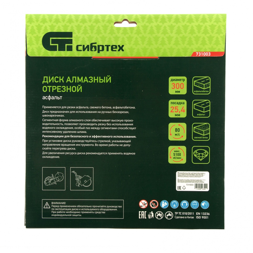 Диск алмазный Сибртех «Асфальт» 731003, ф300 х 25,4 мм, используется для сухого и мокрого реза асфальта, свежего бетона, асфальтобетона, камня, кирпича, абразивных материалов. Он применяется в качестве оснастки для ручных бензорезов или швонарезчиков с посадочным местом 25,4 мм. Диск устойчив к деформациям и выдерживает значительные нагрузки, поэтому имеет высокий рабочий ресурс. Мокрое резание рекомендуется проводить для увеличения ресурса диска.ПреимуществаСегментное строение - в процессе реза обеспечивается отвод тепла и шлама, что повышает производительность диска.Износостойкость - конструкцией круга предусмотрены защитные секторы, предохраняющие сегменты от истирания в месте крепления к корпусу и от налипания асфальтовой крошки на рабочую кромку.Ширина рабочей части 10 мм - производительность остается на стабильно высоком уровне независимо от типа материала (указанного на упаковке).Режущая часть закреплена методом пайки - алмазы надежно удерживаются на диске.