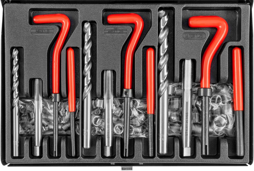 Набор для восстановления резьбы предназначен для ремонта изношенного или поврежденного резьбового соединения. Резьбовые вставки Thorvik изготовлены из коррозионностойкой проволоки ромбического сечения в виде пружинящей спирали. Длина резьбовой вставки 1,5D. Данная технология восстановления резьбы применяется в машиностроении, автомобильной промышленности при ремонтах ГБЦ, КПП, свечных отверстий и форсунок, маслосливных горловин, в медицинской промышленности, энергетике, при ремонтах турбин на атомных электростанциях, в авиационных мастерских, при ремонте военной техники и т.д.