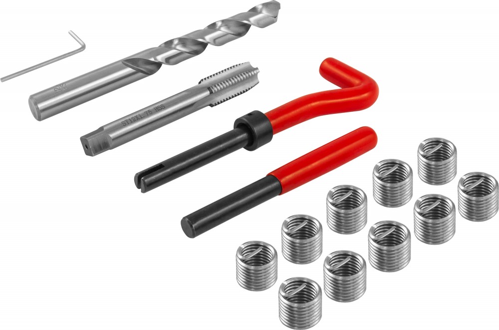 Набор для восстановления резьбы M12x1.75. Набор предназначен для восстановления функциональности и изначальных размеров изношенного или поврежденного резьбового соединения. Длина резьбовой вставки 1,5D.