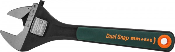 Разводной гаечный ключ с механизмом регулировки размера зева, снабженным специальным устройством, обеспечивающим точную фиксацию губок инструмента на крепеже в независимости от размера метрического или дюймо-вого, практически исключающим присущие обычным разводным ключам люфты. Дополнительно регулировка размера занимает в пять раз меньше времени по сравнению с обычными разводны-ми ключами. Ключ снабжен двусторонней размерной шкалой.