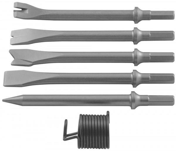 Набор, содержащий, помимо собственно пневматического молотка JAH-6833H, пять наиболее распространенных насадок для производства работ по резке, рубке, разрушению и т.п. металов и материалов различной твердости и пластичности. При проведении работ с использованием этого инструмента необходимо защищать руки, с помощью перчаток, гасящих вибрацию, применять средства защиты органов зрения, дыхания и слуха.