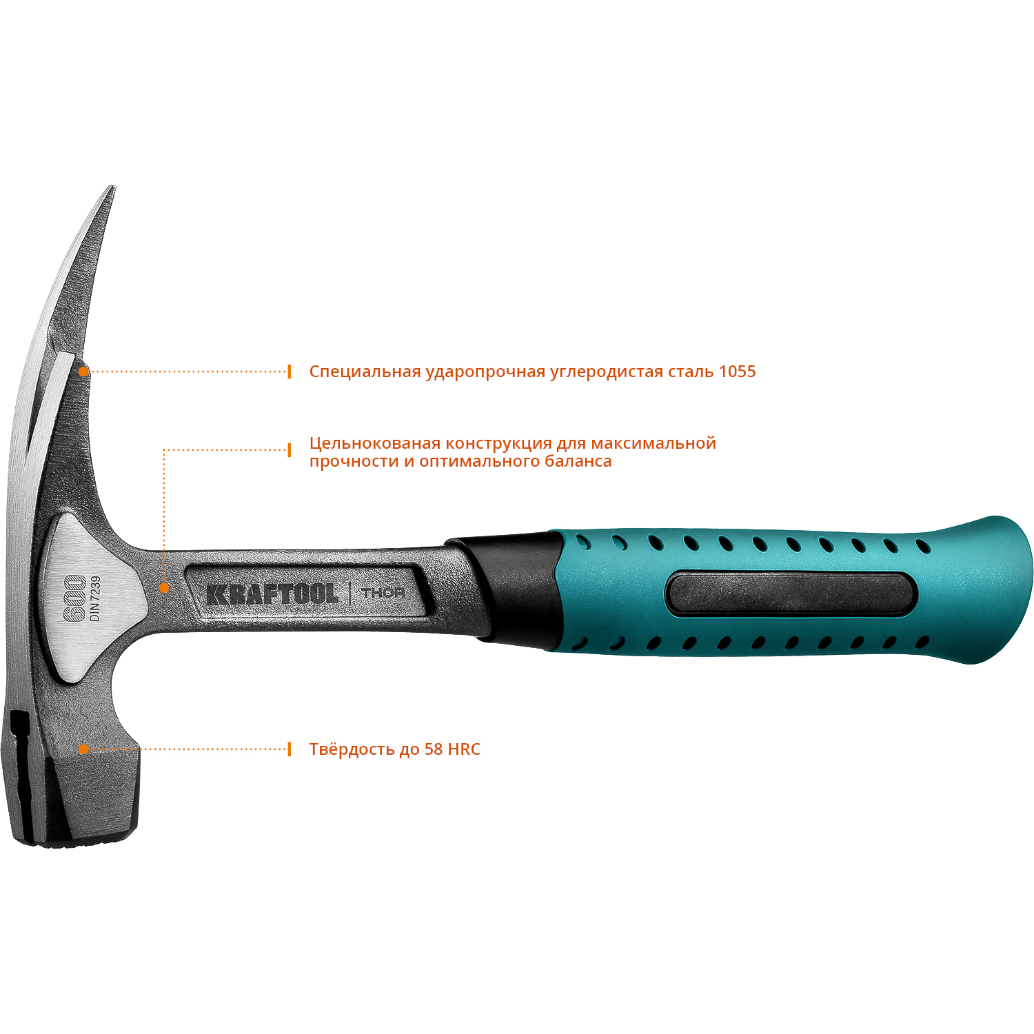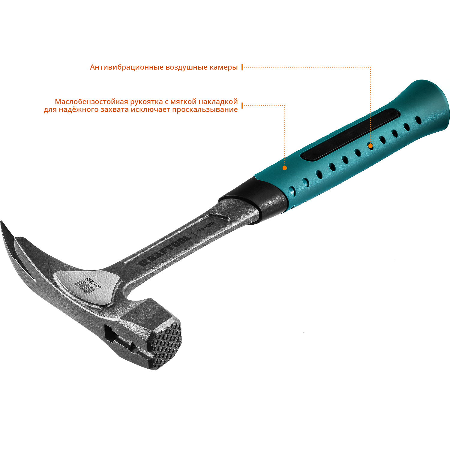 Молоток кровельщика цельнокованый KRAFTOOL THOR 20181, предназначен для выравнивания краев кровли и их закрепления на каркасе крыши. Рабочие поверхности головы (боек и носок) закалены индукционным методом до 50-58 HRC. Специальная конструкция рукоятки эффективно снижает вибрации при ударе, обеспечивая удобство и надежный хват. Воздушные камеры на рукоятке дополнительно гасят вибрации.