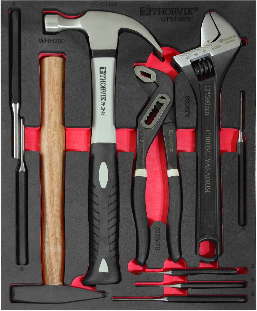 Как купить Набор молотков, выколоток и шарнирно-губцевого инструмента в EVA ложементе 280х375х30 мм, 10 предметов, THORVIK?