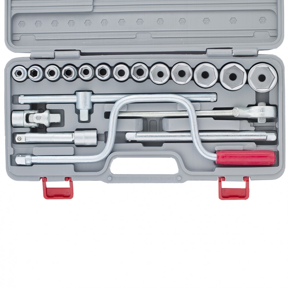 Все инструменты изготовлены из инструментальной стали 40Х и оцинкованы. В комплект входят: трещоточный ключ, ключ с присоединительным квадратом, удлинители 125 и 150 мм, коловорот, шарнир, торцевые головки 10, 11, 12, 13, 14, 15, 17, 19, 22, 24, 27, 30 и 32 мм.