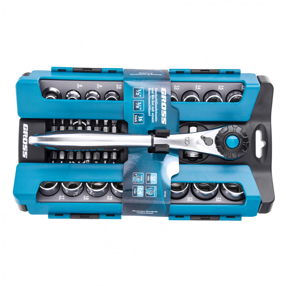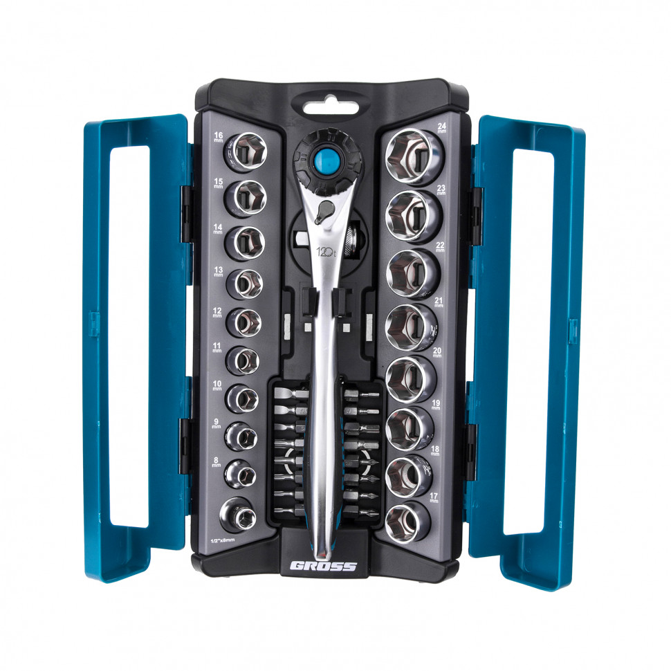 Как купить Набор торцевых головок, трещотка 120 зубьев, 36 пред., 1/2", 3/8”, CrV Gross?