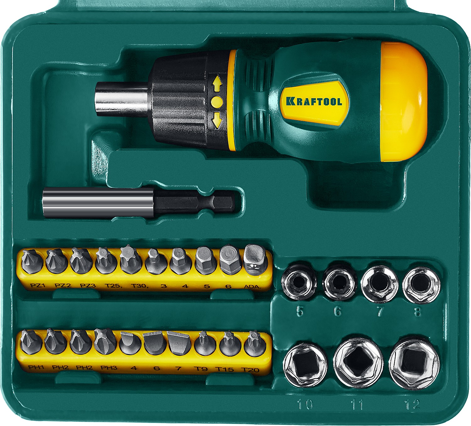 Набор инструментов KRAFTOOL 25556-H29, предназначен для монтажа и демонтажа резьбовых соединений. Биты из хромомолибденовой стали. Эргономичная двухкомпонентная рукоятка обеспечивает надежный и комфортный захват. Отвертка оснащена реверсивным храповым механизмом. Направление вращения меняется одной рукой. Магнитный держатель обеспечивает быструю и надежную замену насадок. Контейнер для хранения бит в корпусе отвертки.