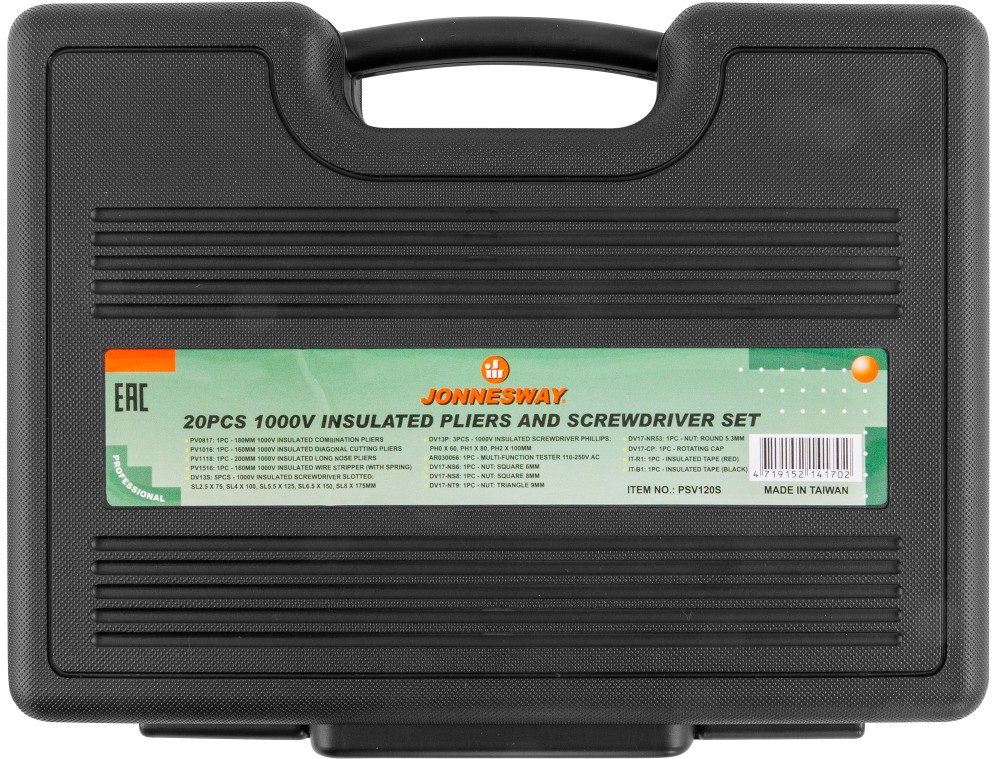 Набор включает: Отвертка стержневая шлицевая диэлектрическая, SL2,5х75 мм Отвертка стержневая шлицевая диэлектрическая, SL4х100 мм Отвертка стержневая шлицевая диэлектрическая, SL5,5х125 мм Отвертка стержневая шлицевая диэлектрическая, SL6,5х150 мм Отвертка стержневая шлицевая диэлектрическая, SL8х175 мм Отвертка стержневая крестовая диэлектрическая, PH0х60 мм Отвертка стержневая крестовая диэлектрическая, PH1х80 мм Отвертка стержневая крестовая диэлектрическая, PH2х100 мм Пассатижи диэлектрические с двухкомпонентными рукоятками, 180 мм Бокорезы диэлектрические с двухкомпонентными рукоятками, 160 мм Щипцы для зачистки, 160 мм (PV1516) Длинногубцы диэлектрические прямые с двухкомпонентными рукоятками, 200 мм Отвертка-тестер многофункциональная, 110V-250V Стержни отверточные диэлектрические с нестандартными рабочими профилями, 4 шт.: Квадрат 6 мм, Квадрат 8 мм, Треугольник 9 мм, Круг 5.3 мм Втулка пластиковая для удобства работы с отверточными стержнями, изолента черная, изолента красная, пластиковый кейс.