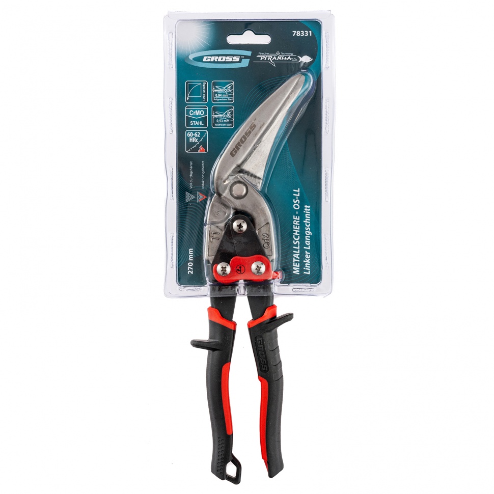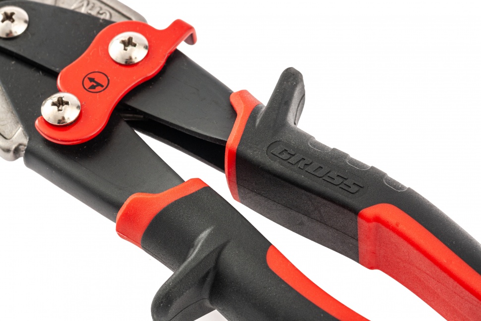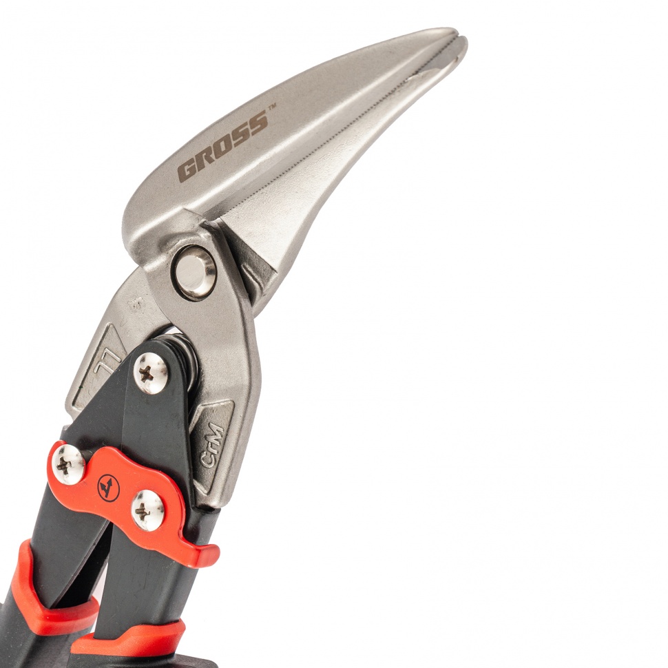 Ножницы по металлу торговой марки GROSS предназначены для проходного прямого и левого реза листового металла толщиной до 1,2 мм и нержавеющей стали толщиной до 0,7 мм. Рабочие части ножниц изготовлены из высоколегированной стали (CrMo), содержание молибдена и ванадия в ее составе придает необходимую жесткость и высокую твердость. Режущие губки проходят процесс индукционной закалки и имеют твердость 60–62 HRС. Ножницы общей длиной 270 мм оснащены эргономичными двухкомпонентными рукоятками, оригинальная форма которых минимизирует риск травм и обеспечивает удобство при длительных работах.
