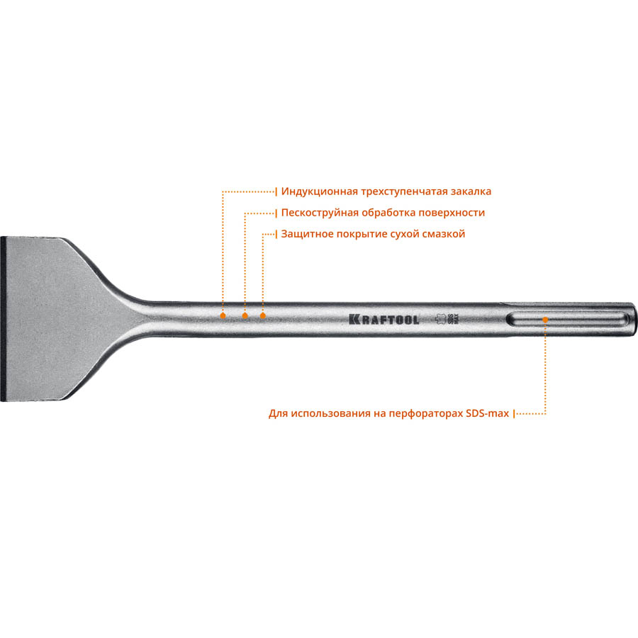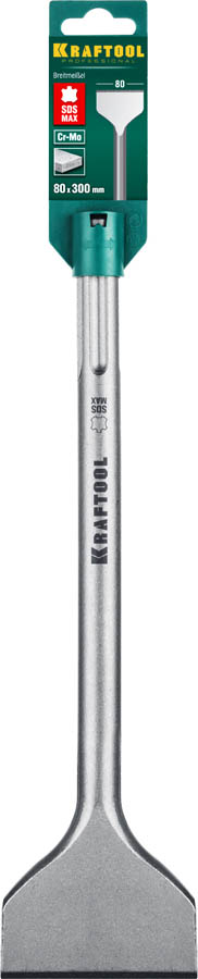 Зубило лопаточное 300 мм, SDS-max, KRAFTOOL 29335-80-300_z01, предназначено для удаления штукатурки, выступов на бетонной обшивке, реконструкции стальных конструкций. Используется с перфораторами SDS-max. Особенности изделия: увеличенный срок службы, индукционная трехступенчатая закалка, высокопрочная легированная сталь. Обладает высокой стойкостью к ударам и динамическим нагрузкам.