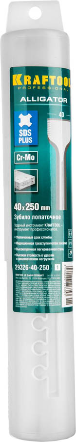 Зубило лопаточное 250 мм, SDS-Plus, KRAFTOOL29326-40-250_z01, предназначено для удаления штукатурки, выступов на бетонной обшивке, реконструкции стальных конструкций. Используется с перфораторами SDS-plus. Особенности изделия: увеличенный срок службы, индукционная трехступенчатая закалка, высокопрочная легированная сталь. Обладает высокой стойкостью к ударам и динамическим нагрузкам