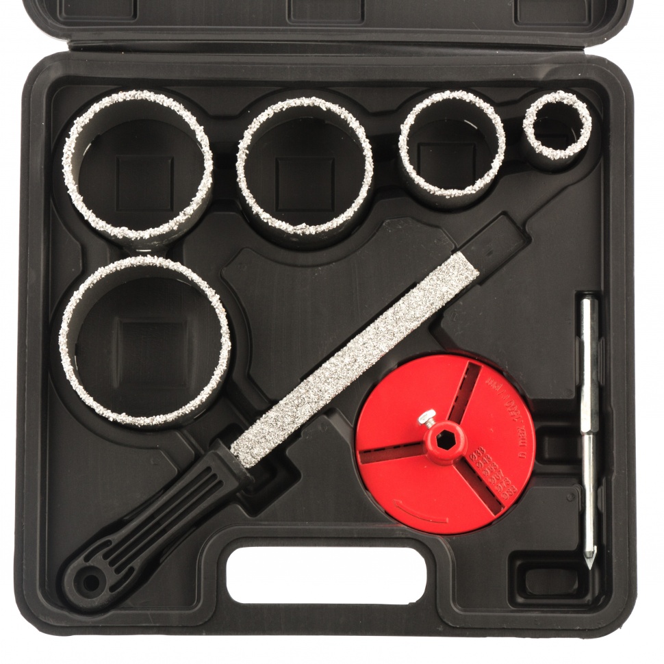 Набор кольцевых коронок ТМ Matrix ?33-53-67-73-83 мм предназначен для сверления отверстий в керамической плитке, ячеистом бетоне, пенобетоне, газосиликате, кирпиче при помощи дрели или шуруповерта. Рабочая часть коронки и напильника - карбид вальфрама. Не подходит для сверления керамогранита. В наборе идет центрирующее (направляющее) сверло для удобства засверливания. Центрирующее сверло имеет износостойкую твердосплавную пластину из ВК6, а также 6-гранный хвостовик препятствующий прокручиванию в патроне. Сверление производить в безударном режиме, с использованием водяного охлаждения. Рекомендуемые обороты 550-1500 об/мин. Комплект: универсальная державка - 1шт, кольцевые сверла -4шт, центрирующее сверло - 1шт, напильник- 1 шт, пластиковый бокс - 1шт.